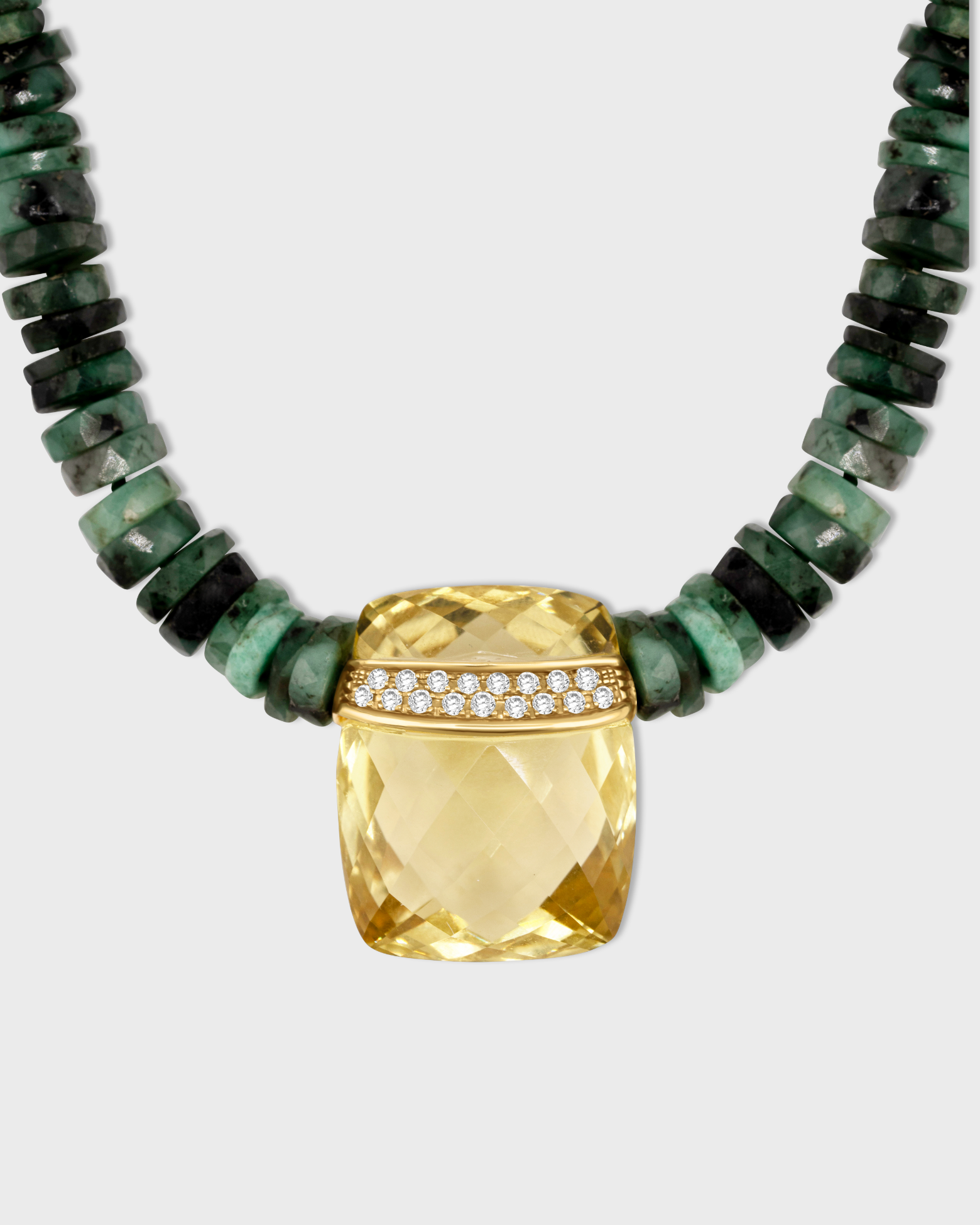 A vibrant green emerald beaded chain, with each emerald stone carefully arranged in a layered design for added texture and depth. The centerpiece is a striking lemon quartz pendant with a faceted cut, which creates a brilliant, eye-catching sparkle. The quartz pendant is accented with a sleek gold bar adorned with small diamonds, adding a luxurious touch.