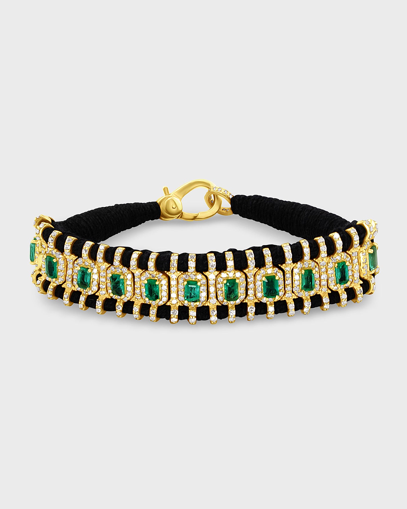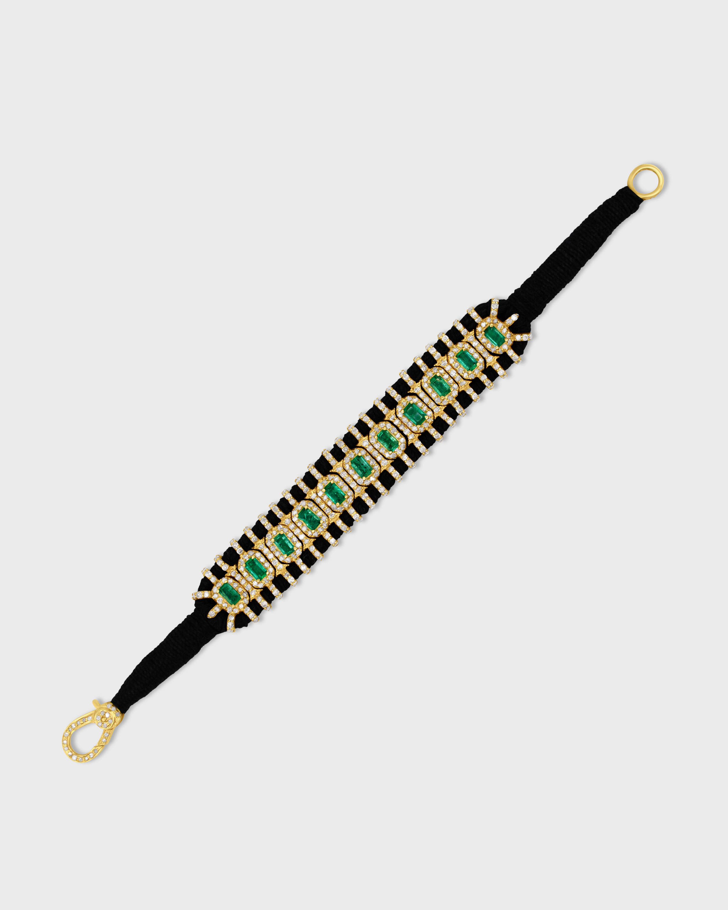 Handcrafted in NYC, this stunning piece features vibrant emerald-cut emerald framed by sparkling diamonds. The intricate gold weave adds texture and contrast, creating a luxurious look. The black silk cotton woven provides comfort and a striking backdrop, making this bracelet a true statement piece for any occasion.