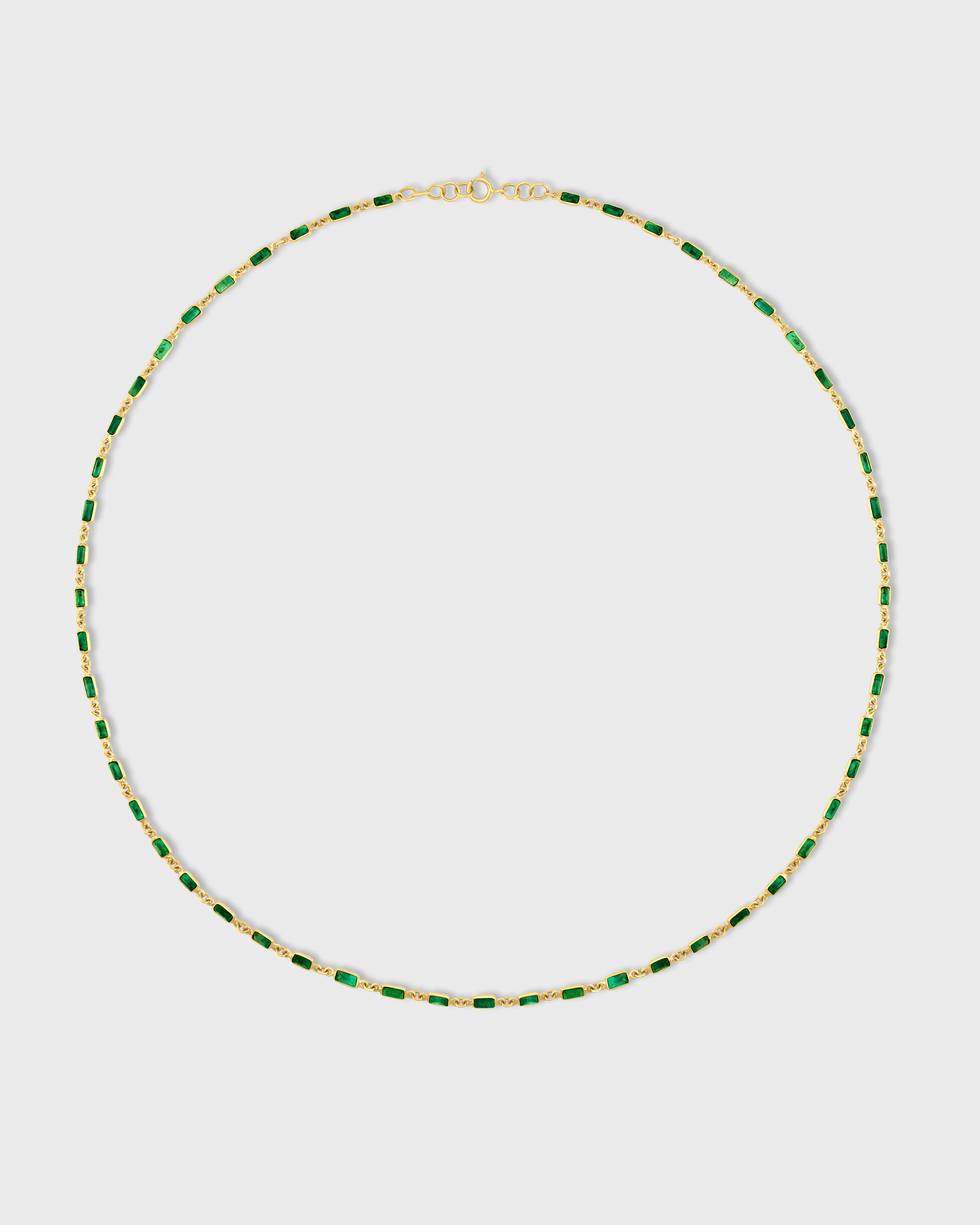 Handcrafted in NYC, this exquisite 14k gold necklace features an alternating pattern of delicate chain and vibrant emerald-cut green gemstones.