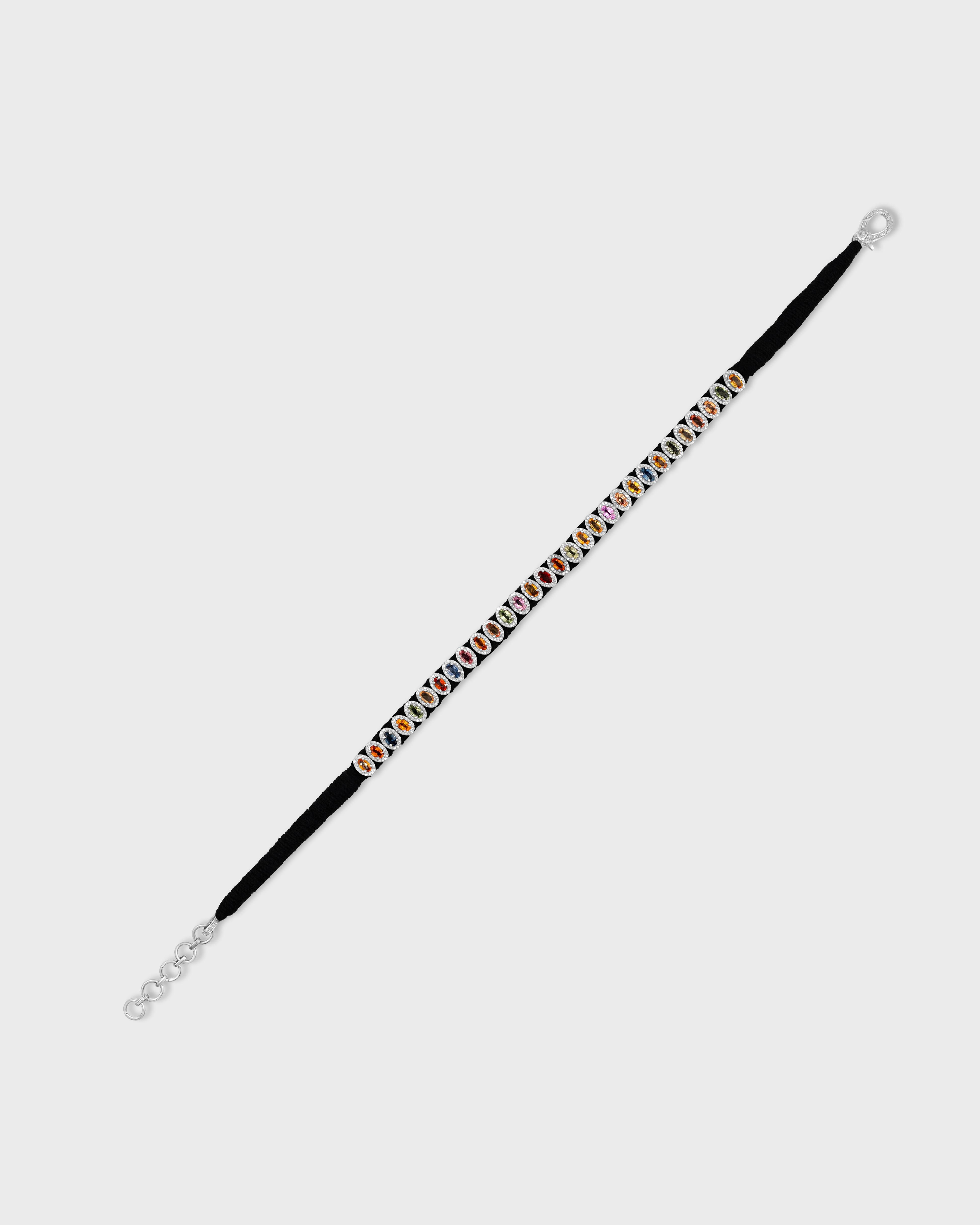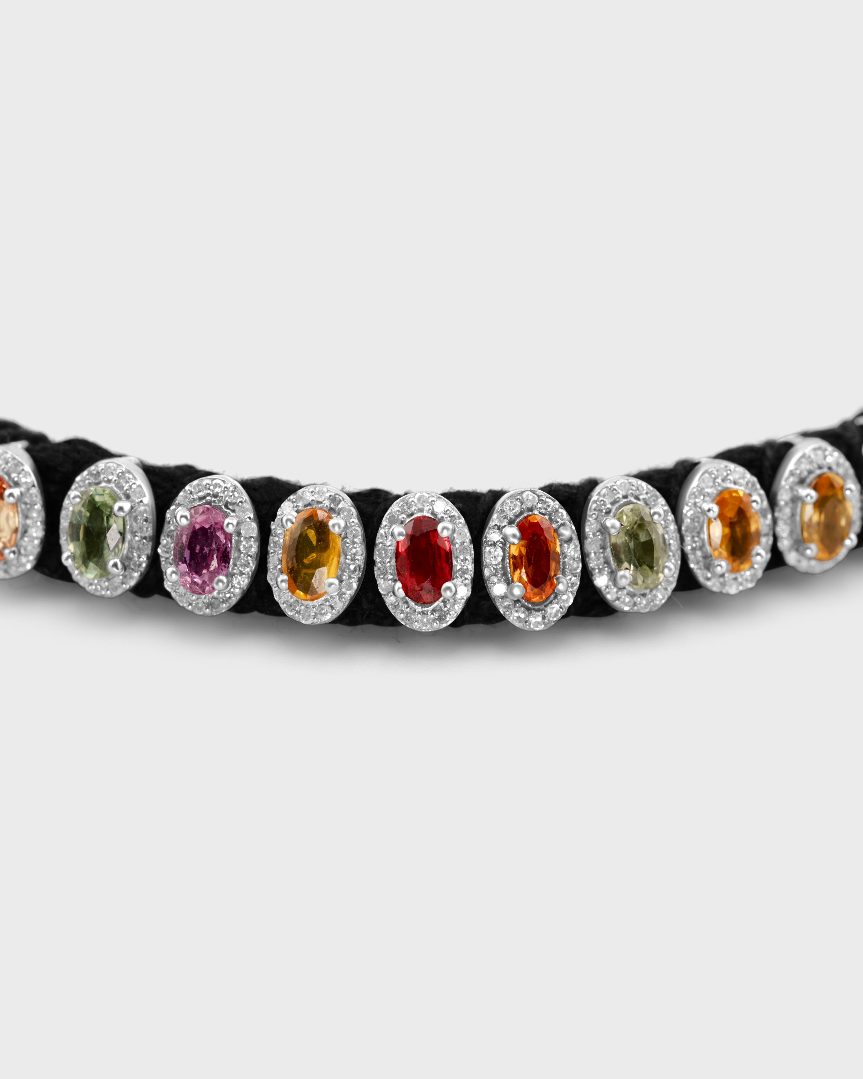This stunning piece features vibrant oval-cut rainbow sapphires framed by sparkling diamonds, set in silver. Handcrafted in the heart of New York City.