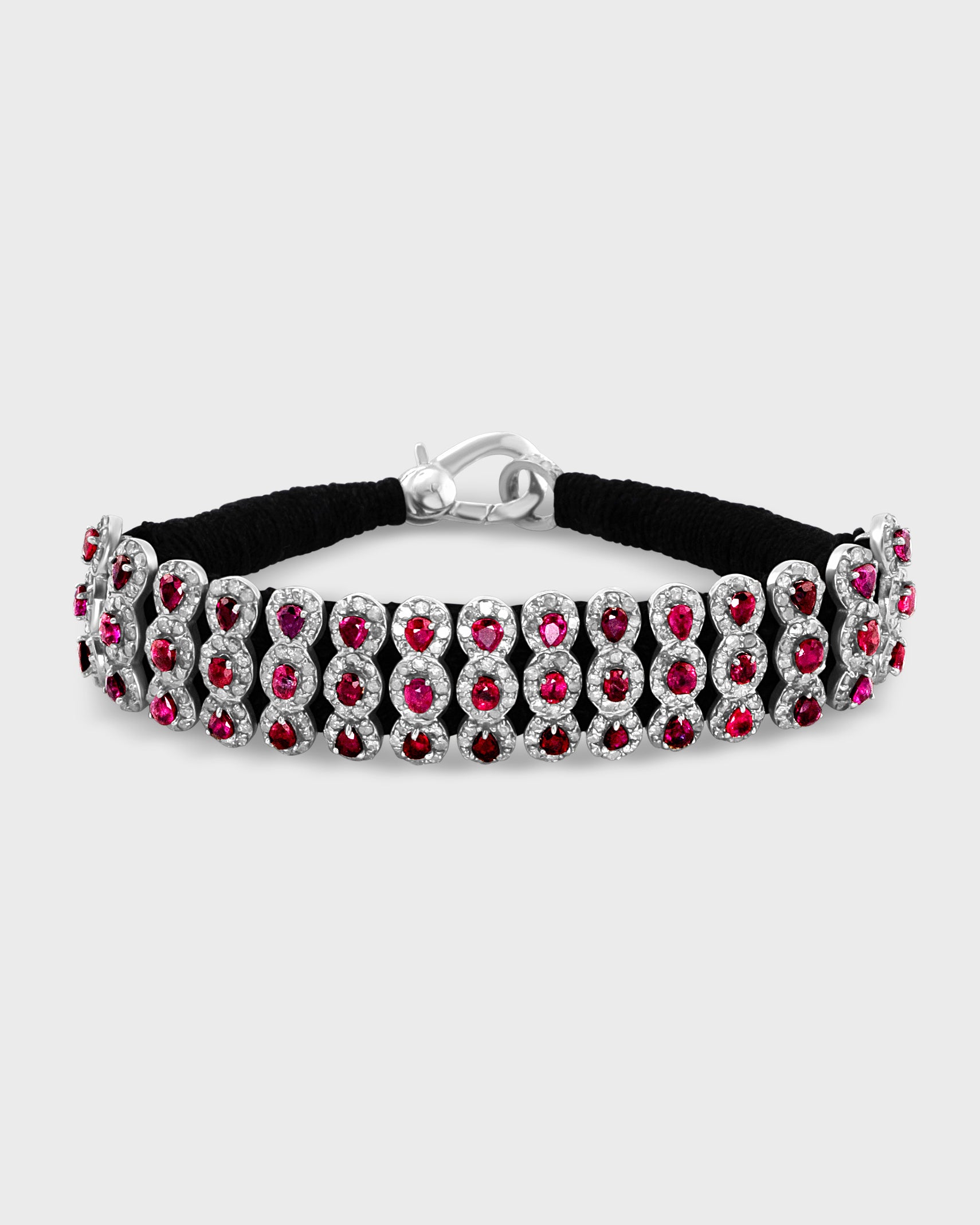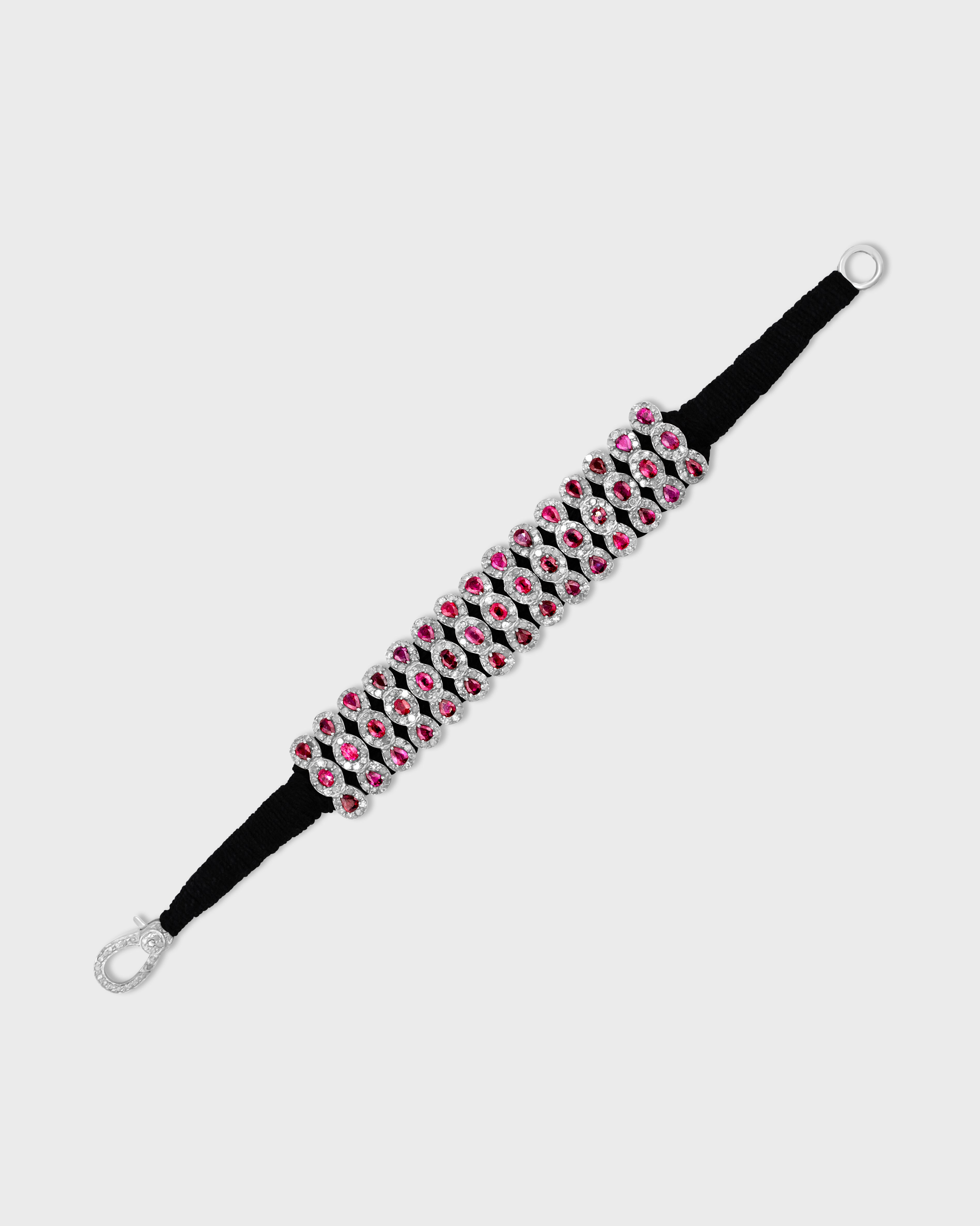 A romantic triple row diamond halo ruby bracelet. Handcrafted in NYC.