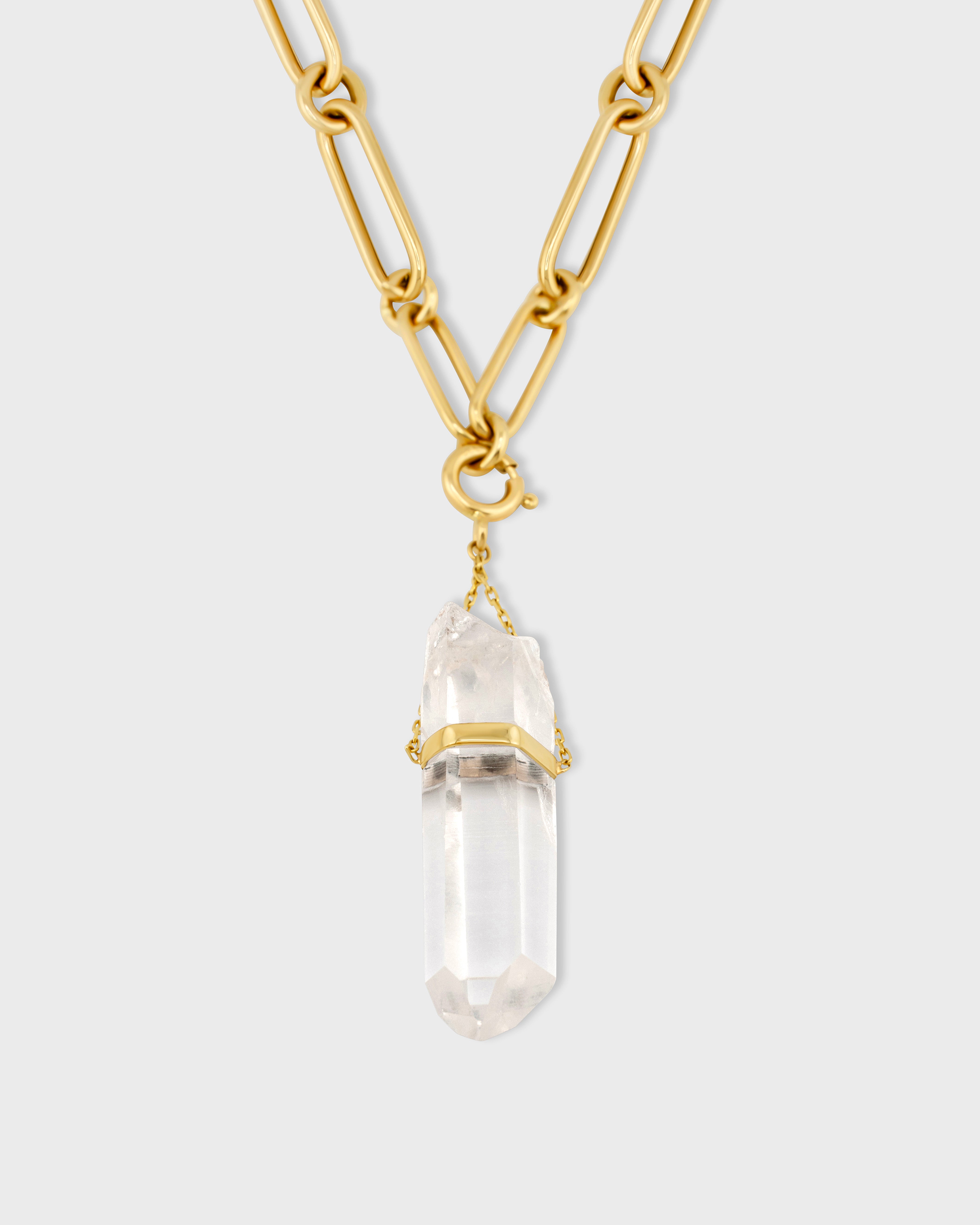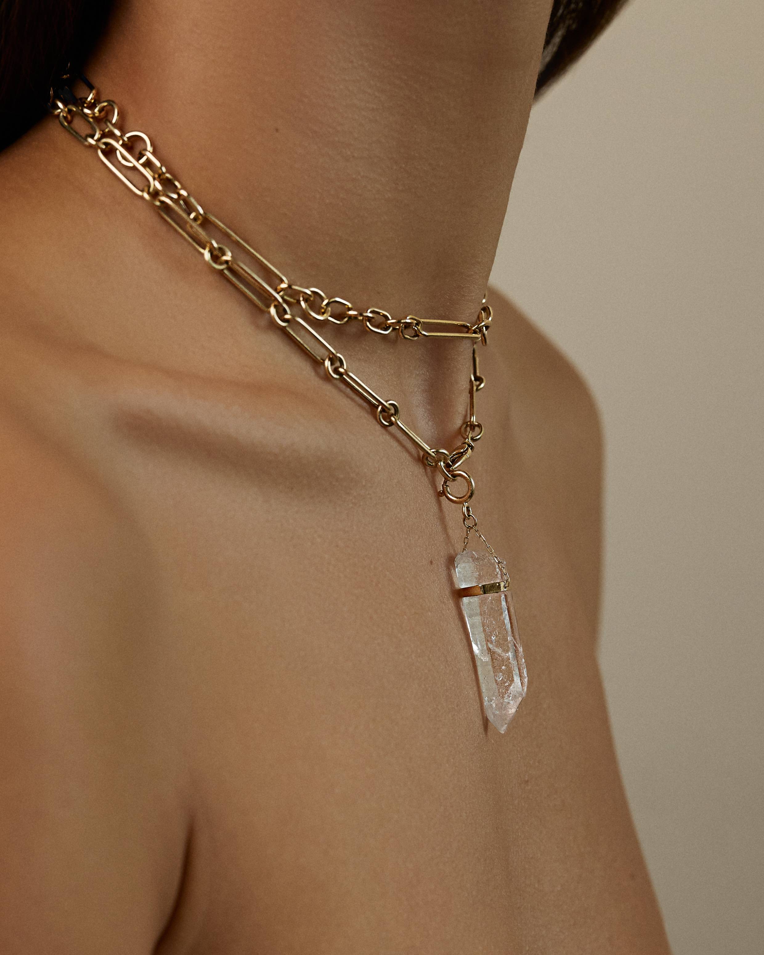 Statement piece with a one of a kind crystal ready to attune to the vibration of each individual wearer. The crystal is detachable and one can attach their own charms to this Italian chain.