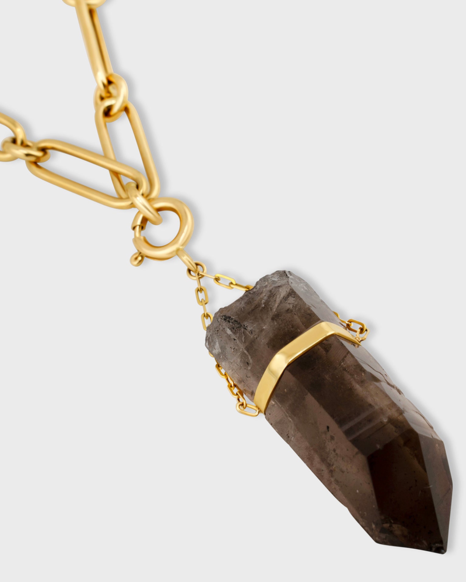 A statement piece with a one of a kind crystal that supports grounding and protection. The crystal is detachable and one can attach their own charms to this Italian chain.
