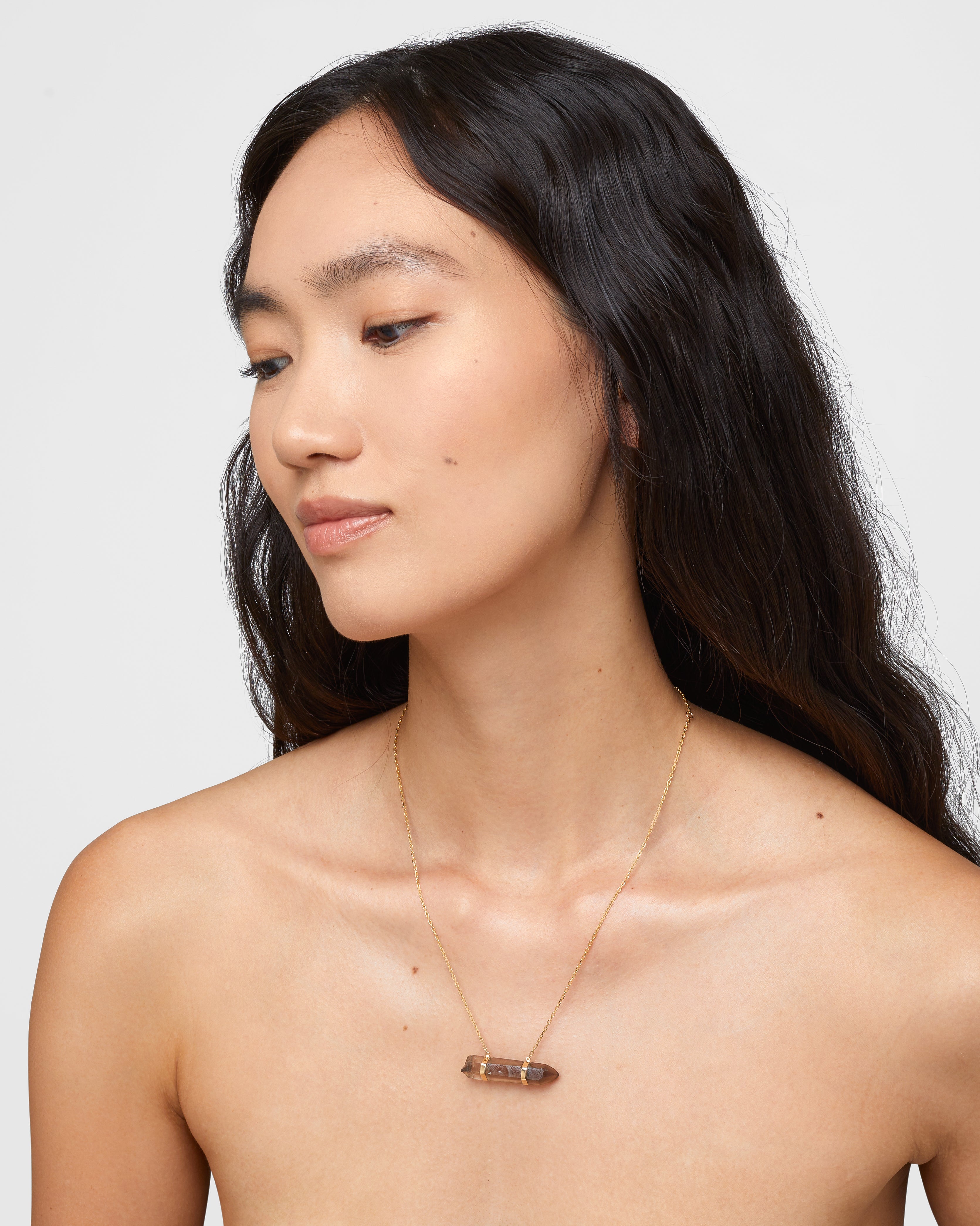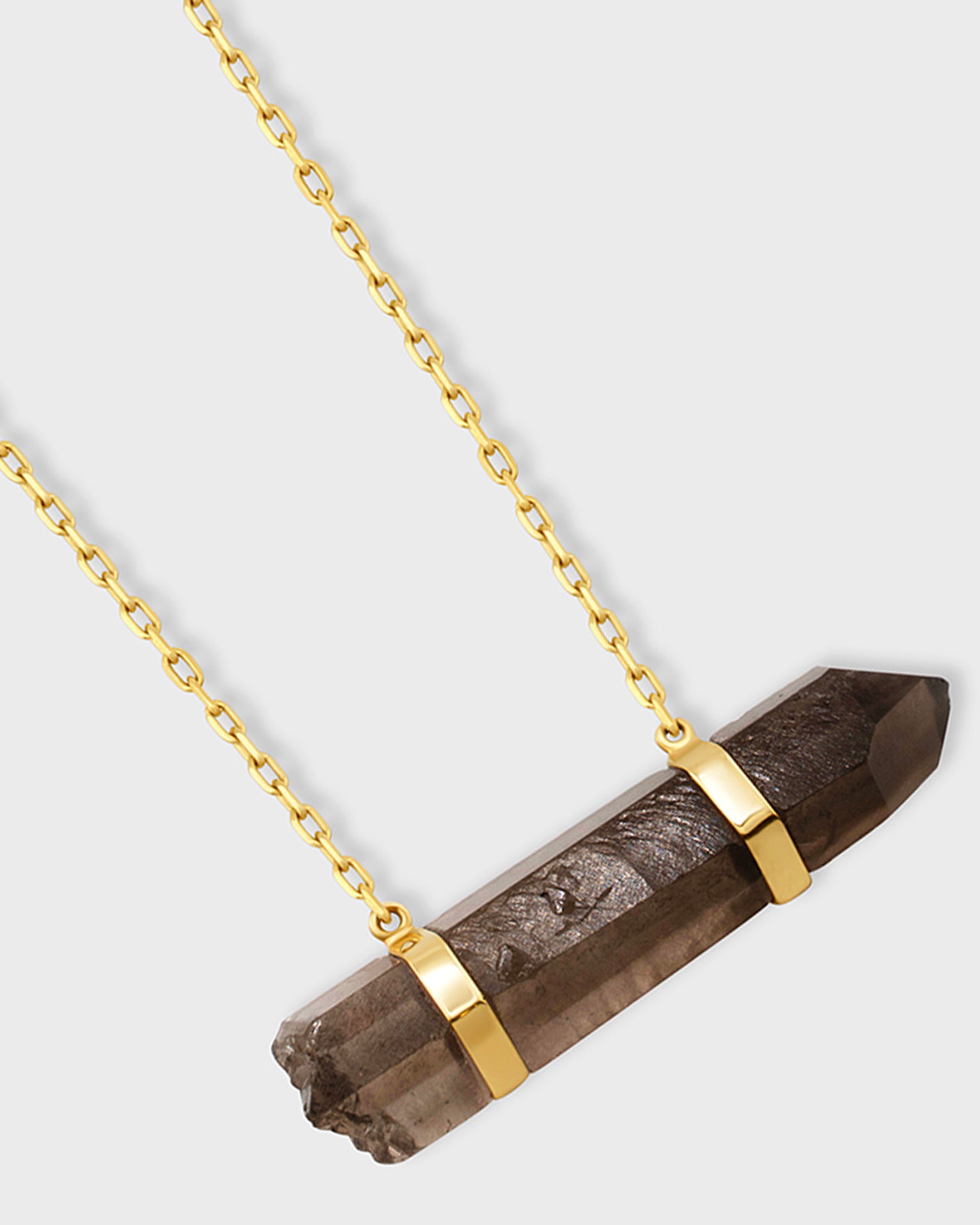 Double gold bar smoky quartz necklace flanking both sides of the crystal makes this a perfect top layering piece. The Master of all grounding stones, the Smoky Quartz. Natural, uncut, untreated, unpolished one of a kind mineral custom hand set in yellow gold and Italian chain.