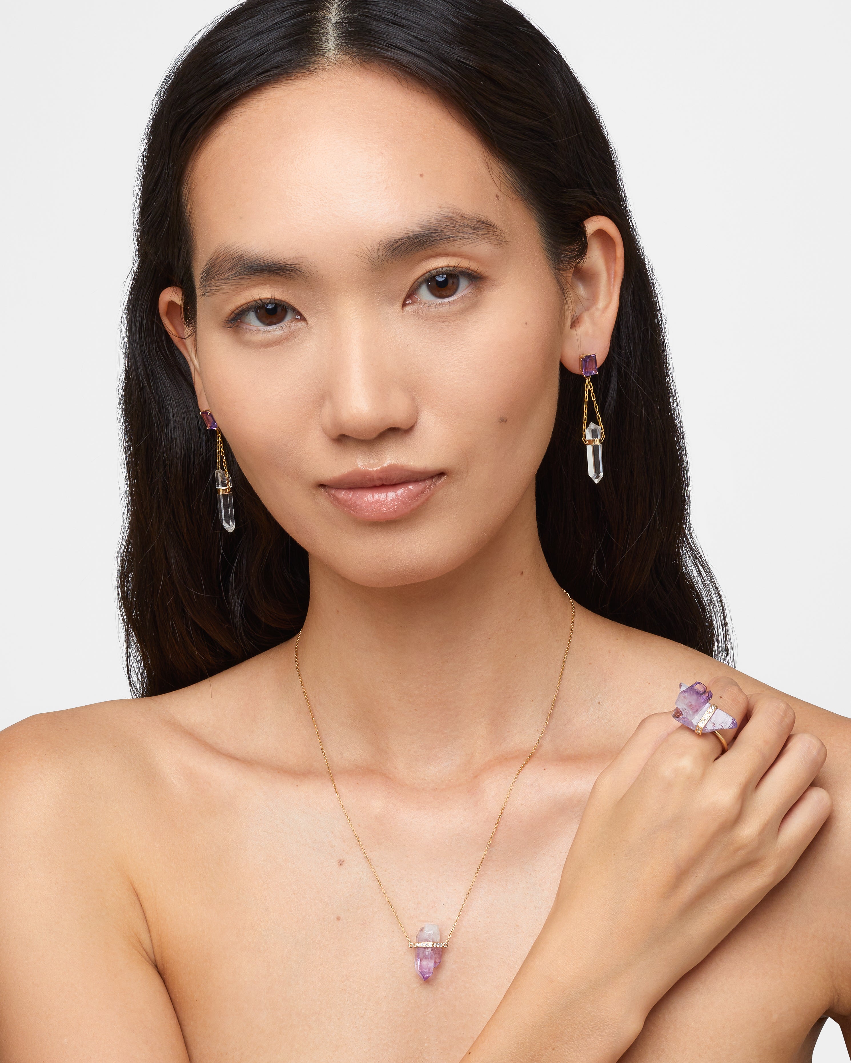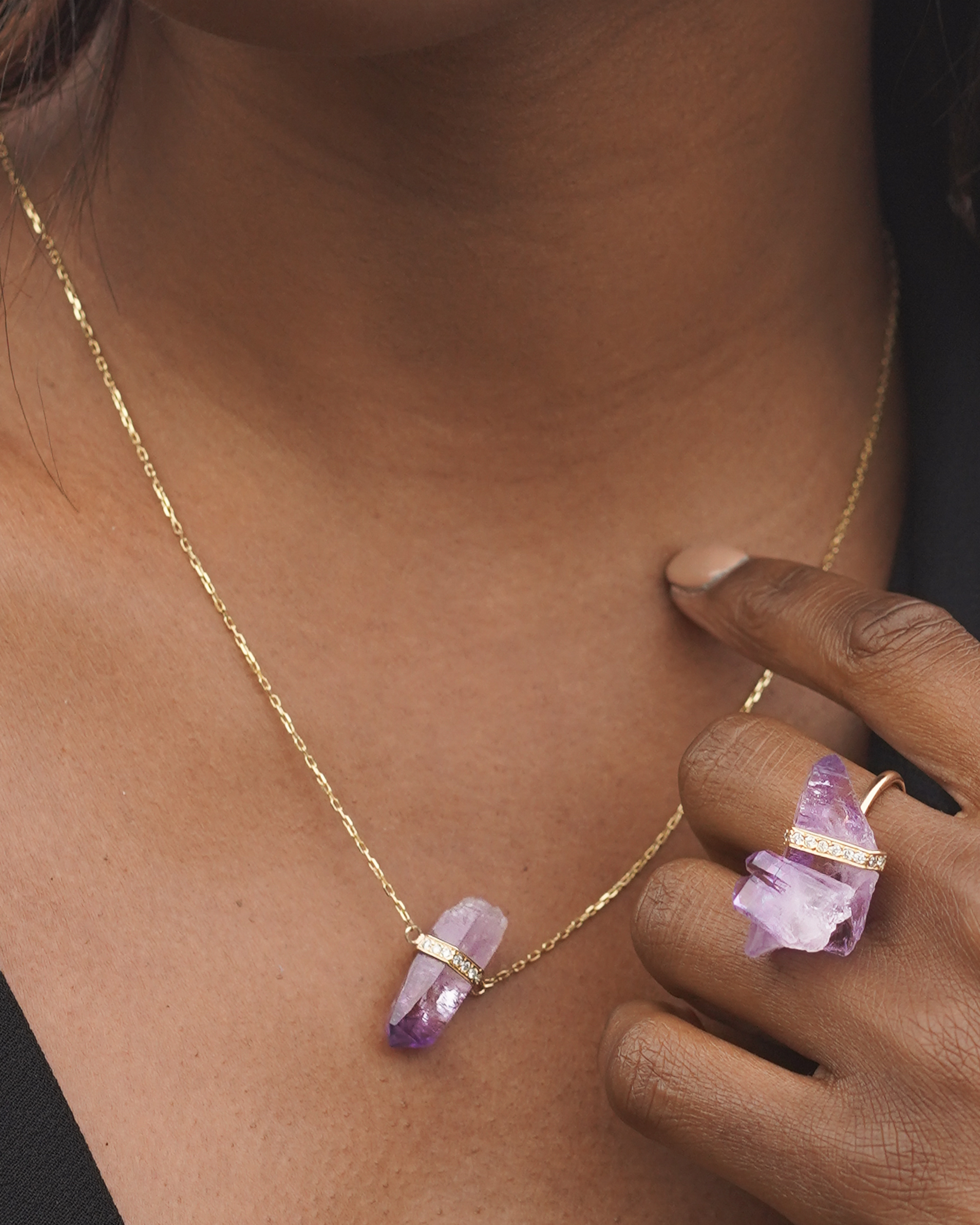 Above, a collection of raw amethyst crystals ethically sourced from Brazil for JIA JIA jewelry pieces
