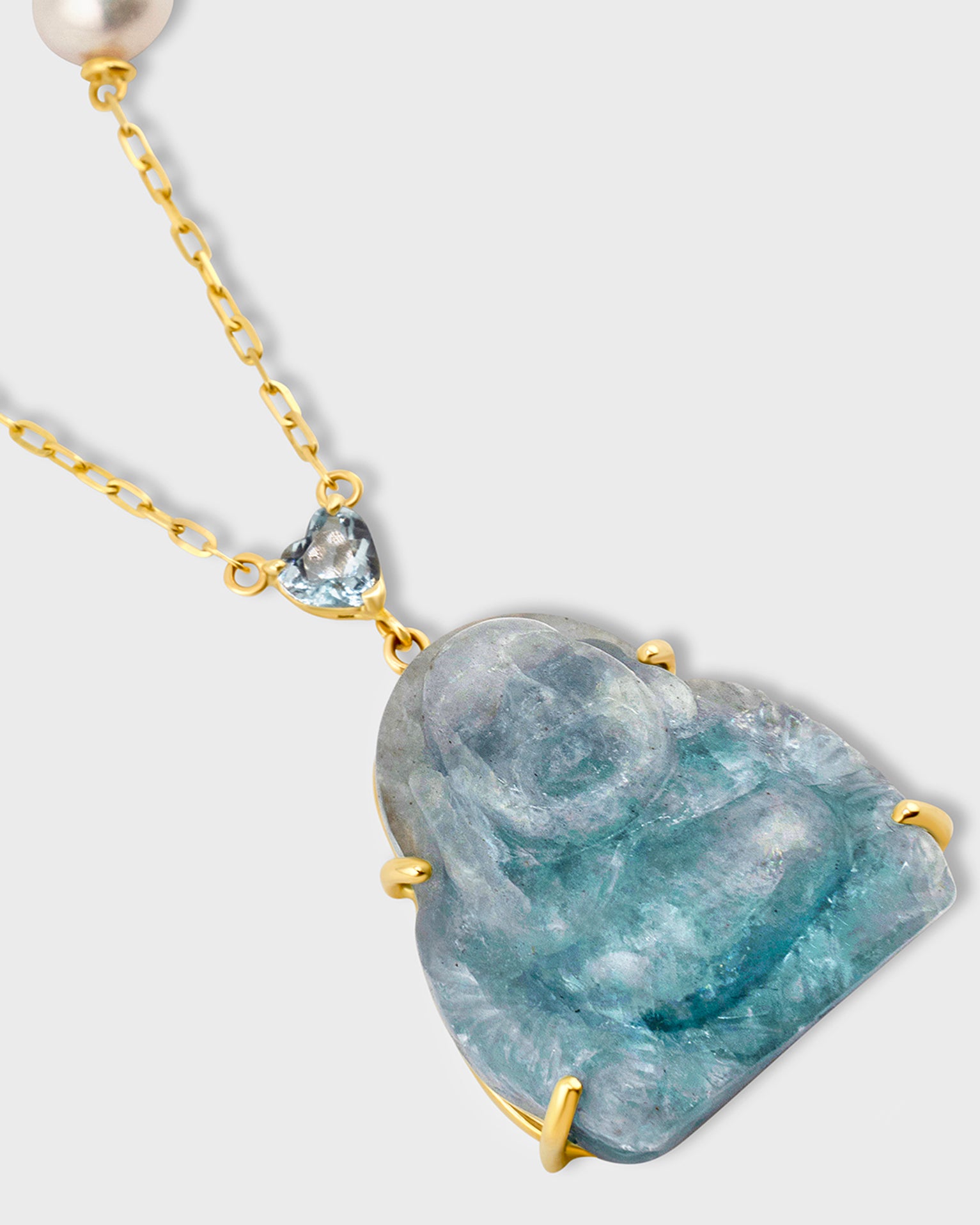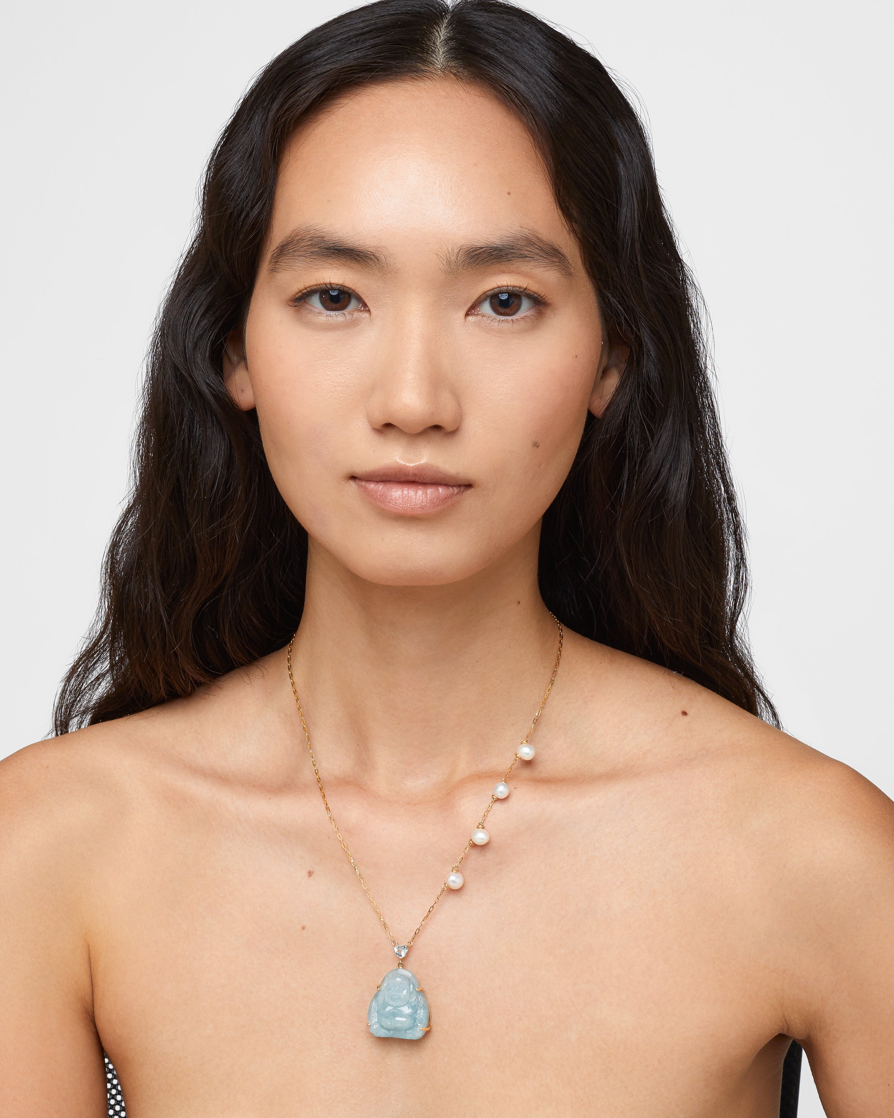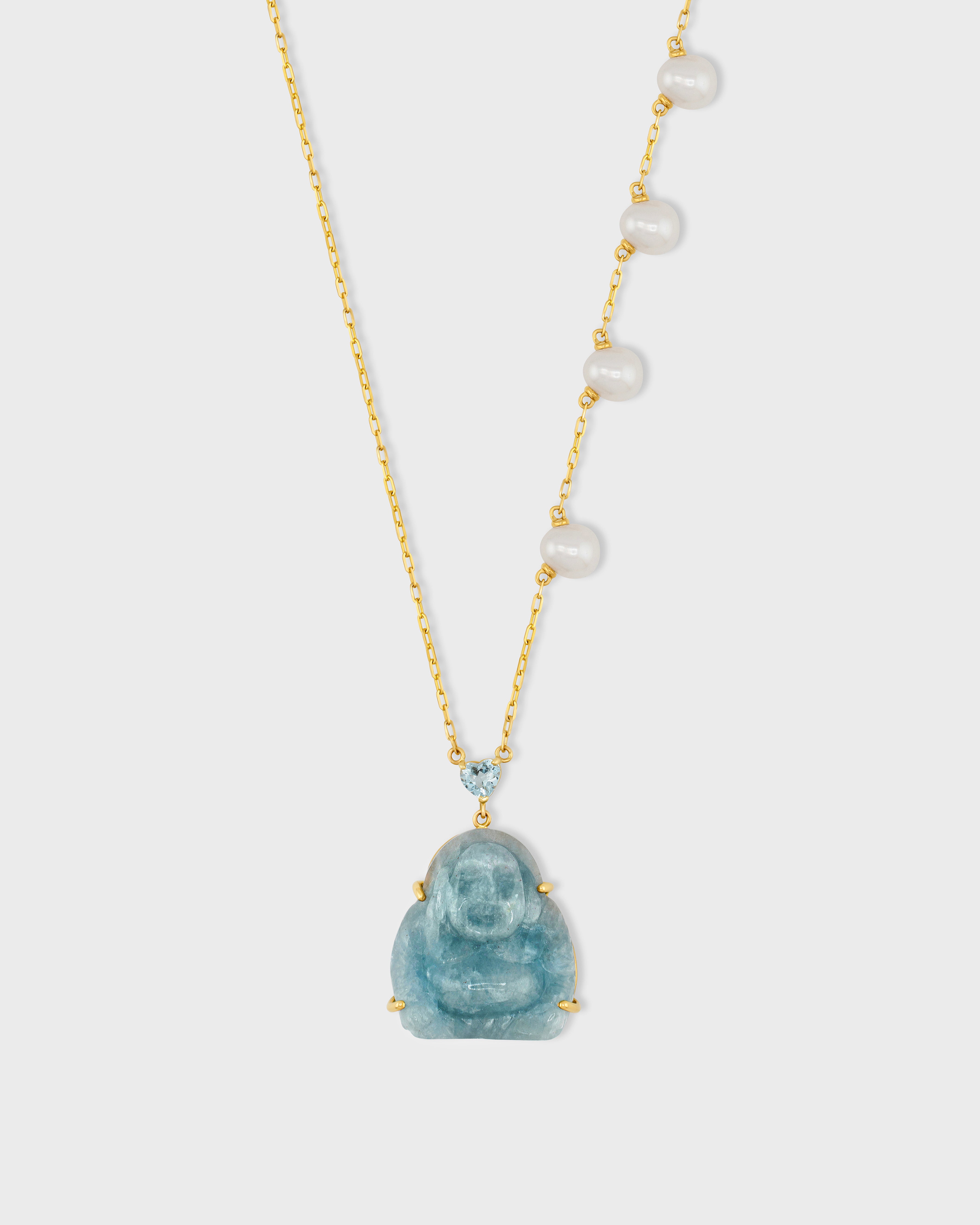 This charming necklace features a smiling Buddha pendant carved from aquamarine gemstone, suspended from a delicate 14k gold and pearl chain. The Buddha is depicted with a serene expression and is adorned with a crown made of a tiny aquamarine gemstone. This necklace is handcrafted in NYC and is a perfect everyday piece that adds a touch of spiritual significance and positive vibes to any outfit.