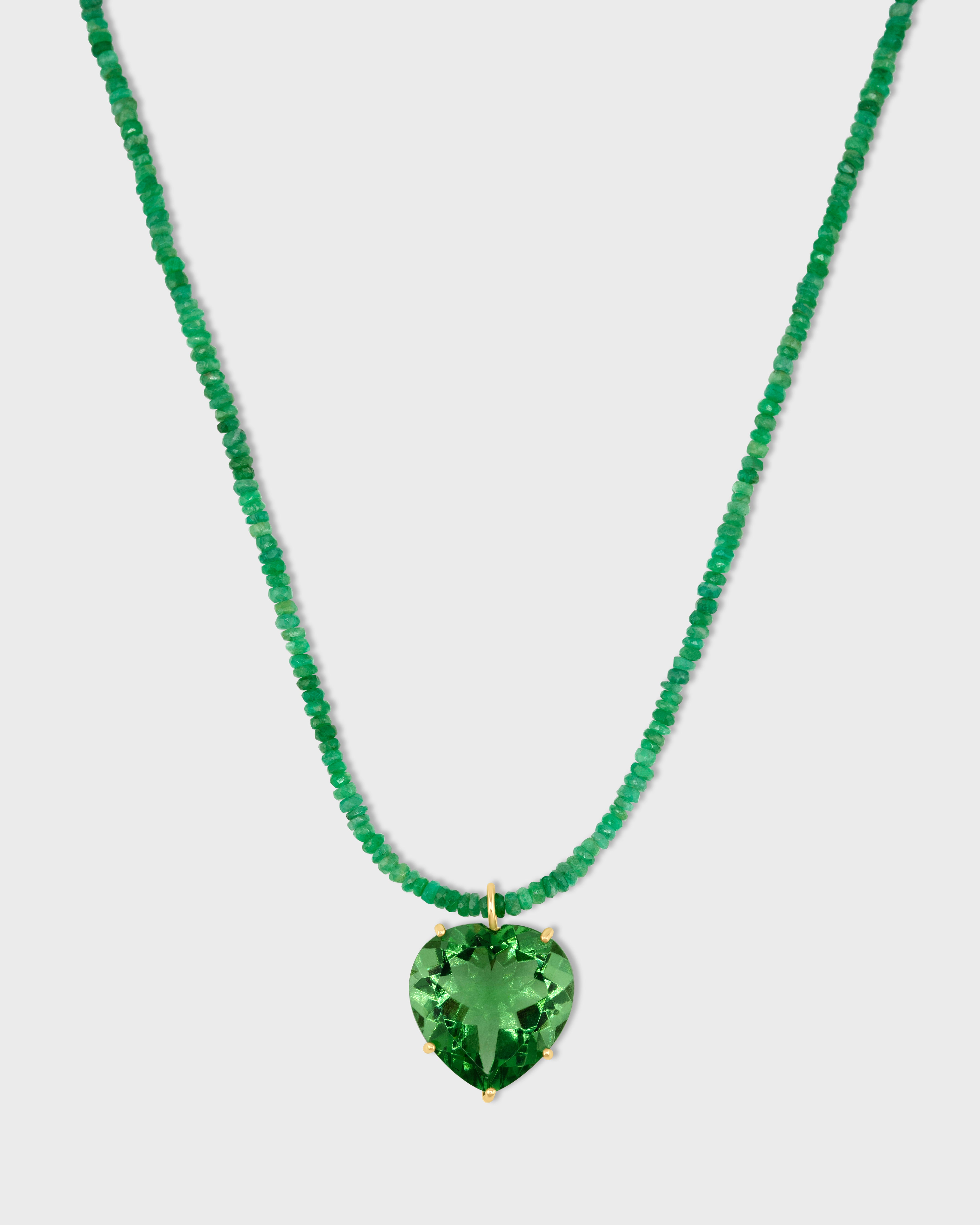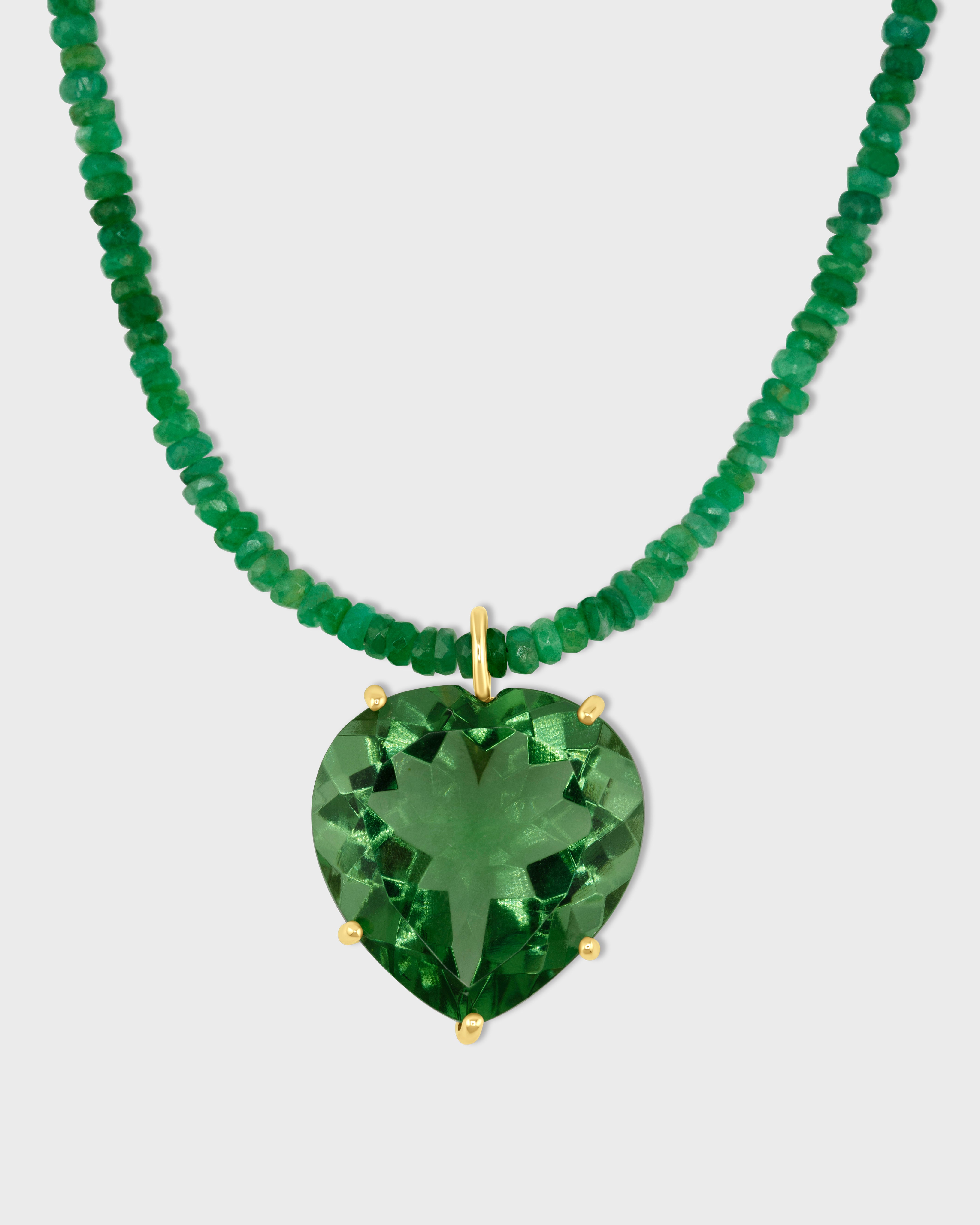 This piece features a stunning heart-shaped green amethyst gemstone pendant paired with emerald beads set in 14k Gold. Handcrafted in NYC.