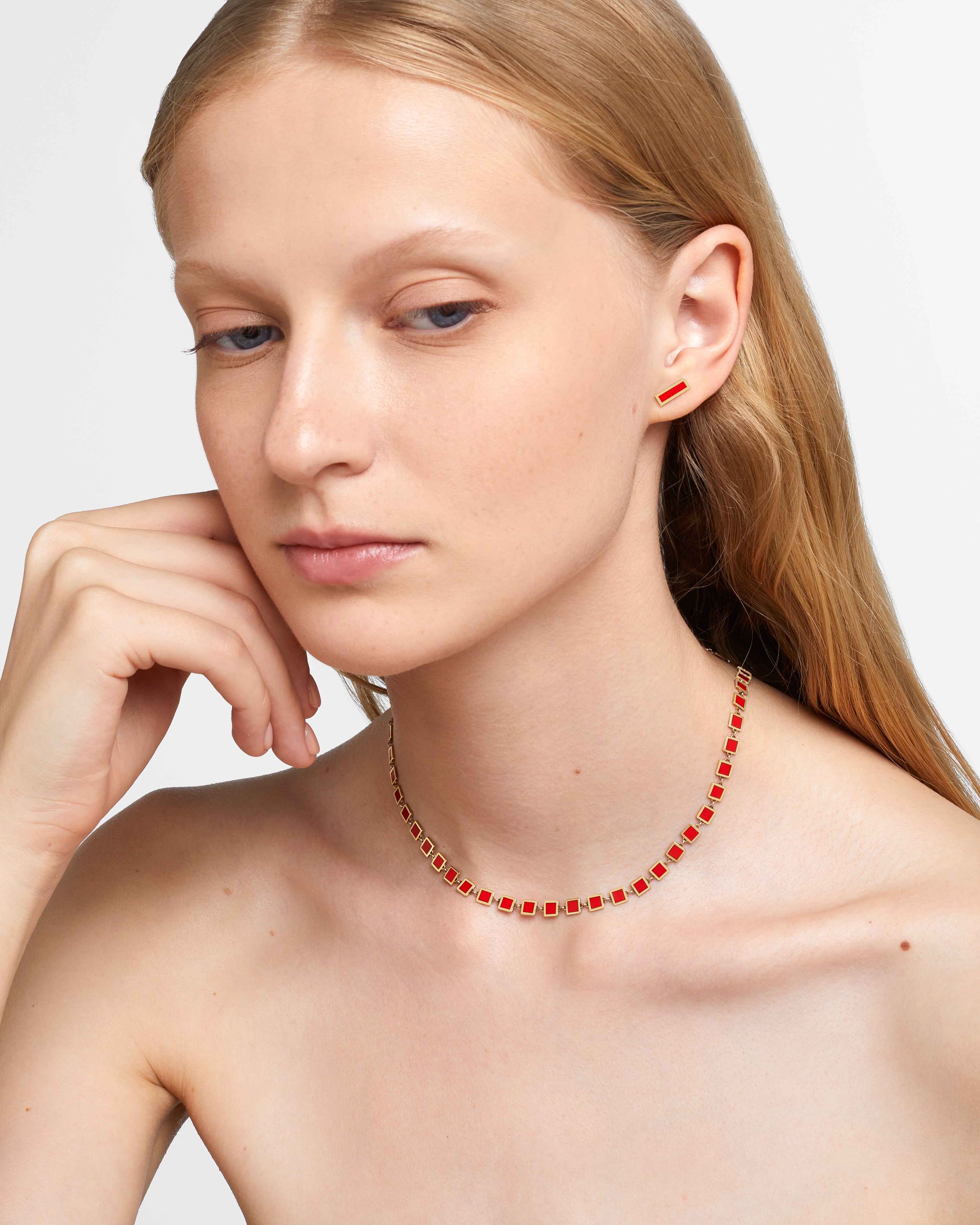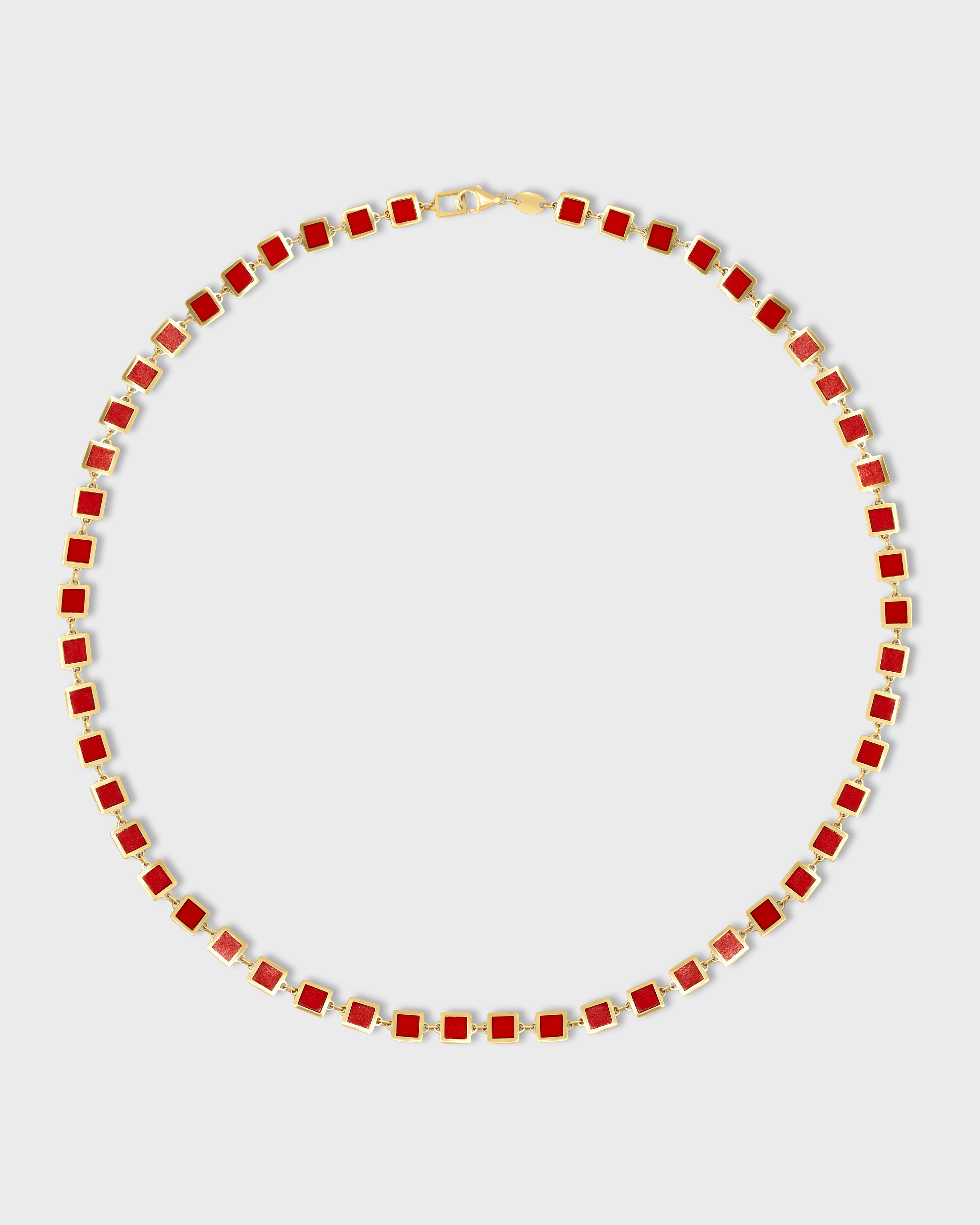 This delicate piece showcases a 14k gold setting for lasting luxury, featuring square red coral inlays that adds a vibrant pop of color.