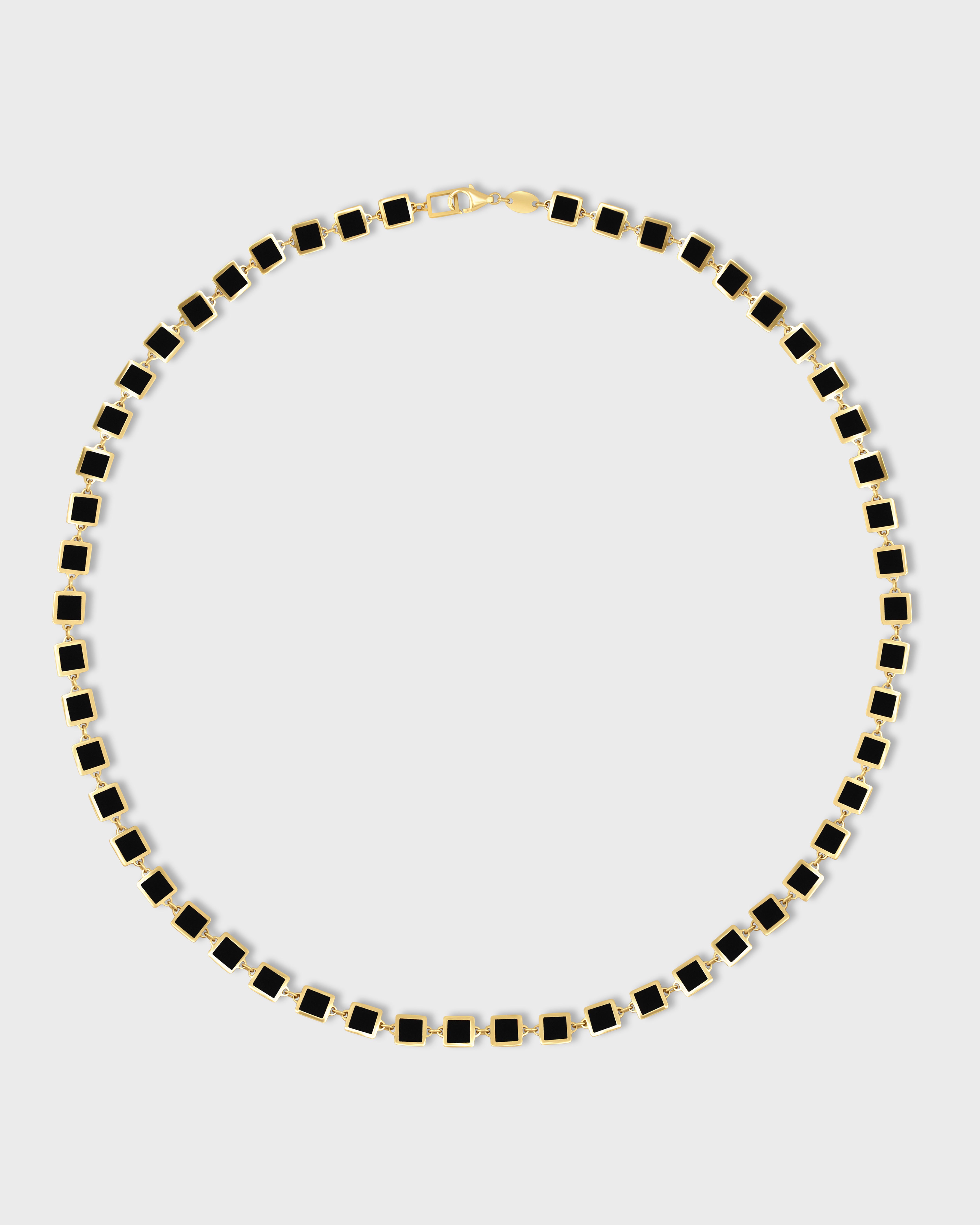 This delicate piece showcases a 14k gold setting for lasting luxury, featuring square black onyx inlays that adds a vibrant pop of color.
