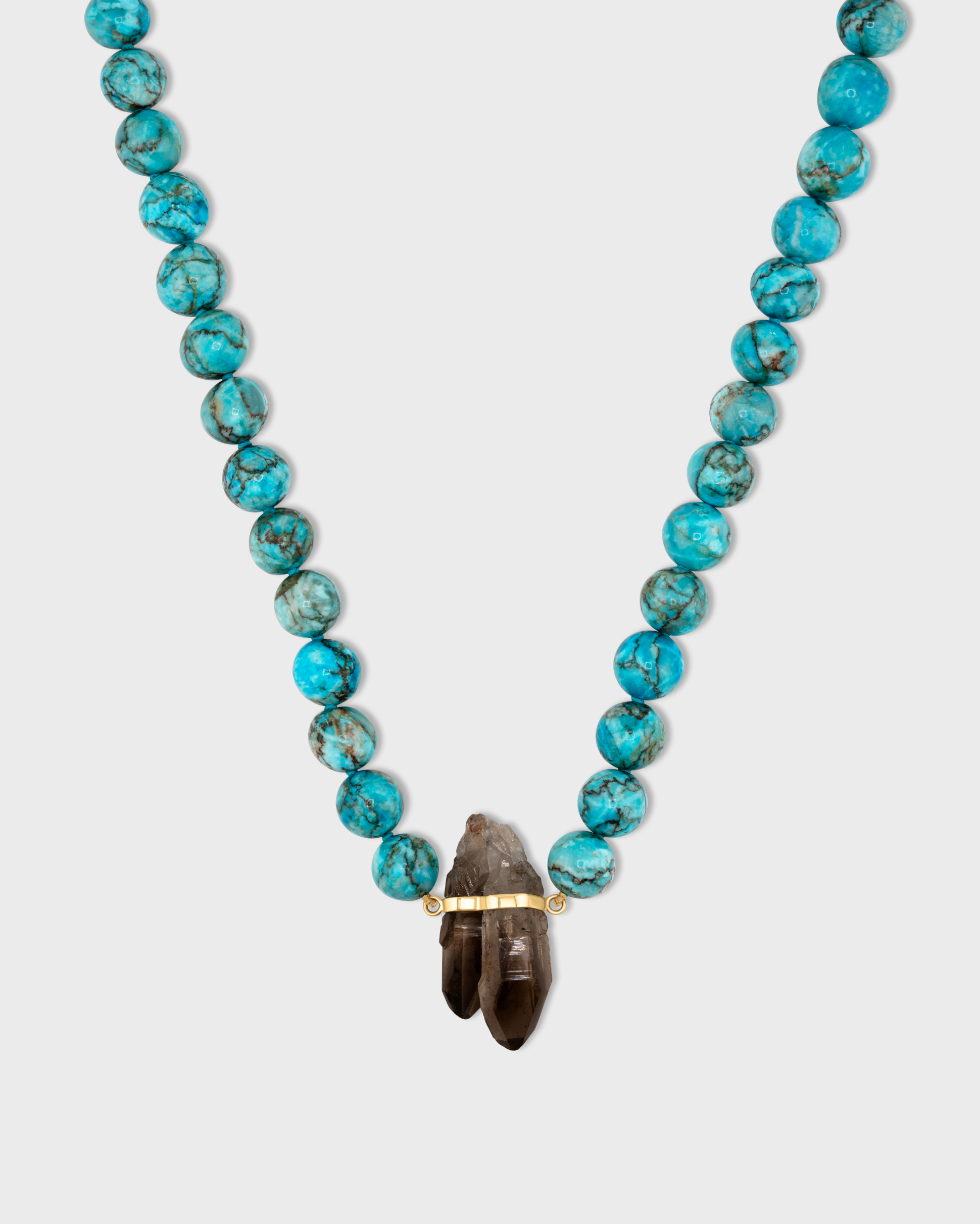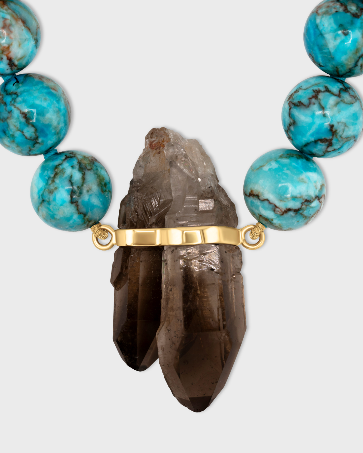 This necklace features turquoise sphere beads paired with a unique smoky quartz charm in the center. The turquoise beads have a marbled, natural look with shades of blue and green, while the central charm is composed of raw smoky quartz crystals bound together with a gold-colored band.
