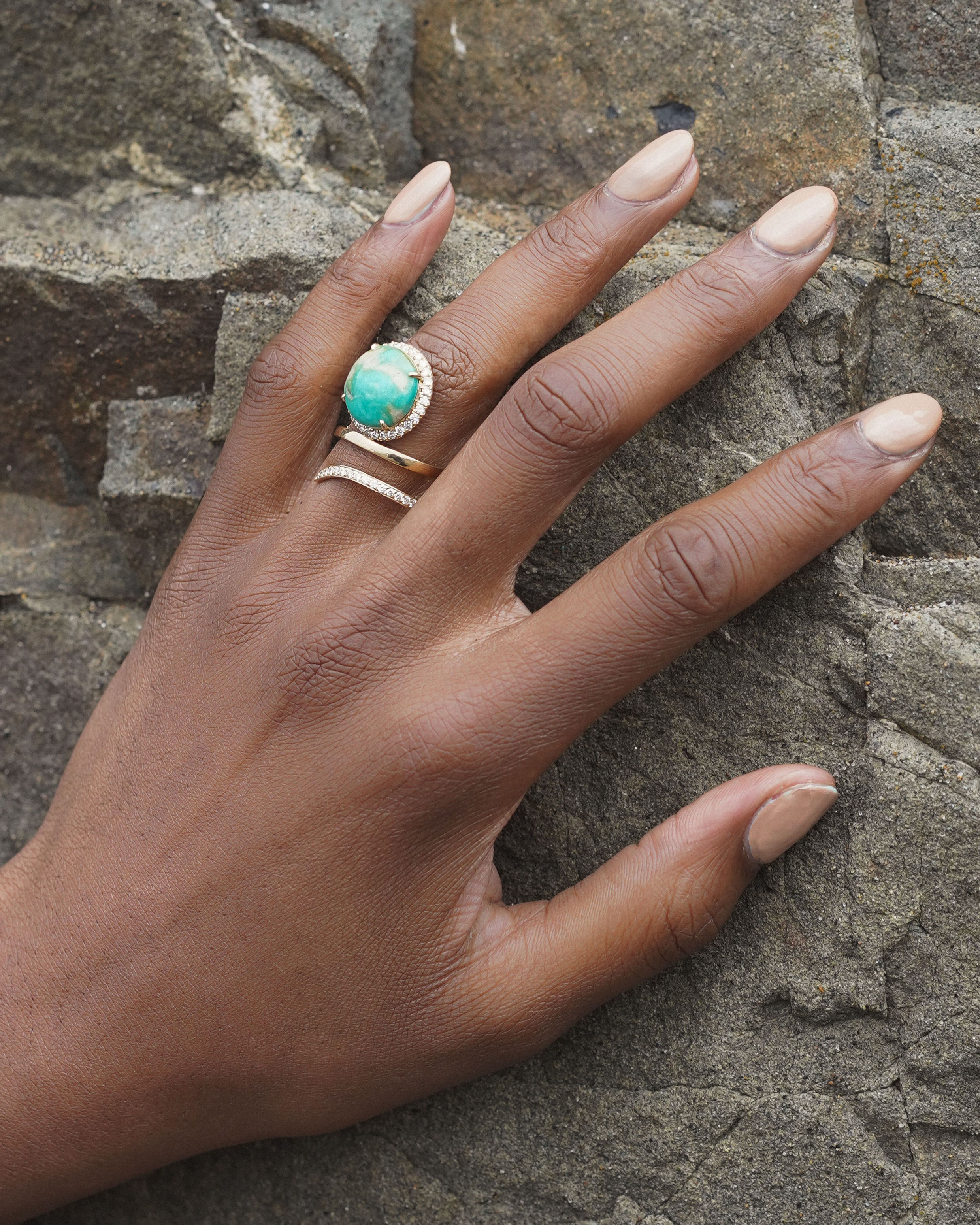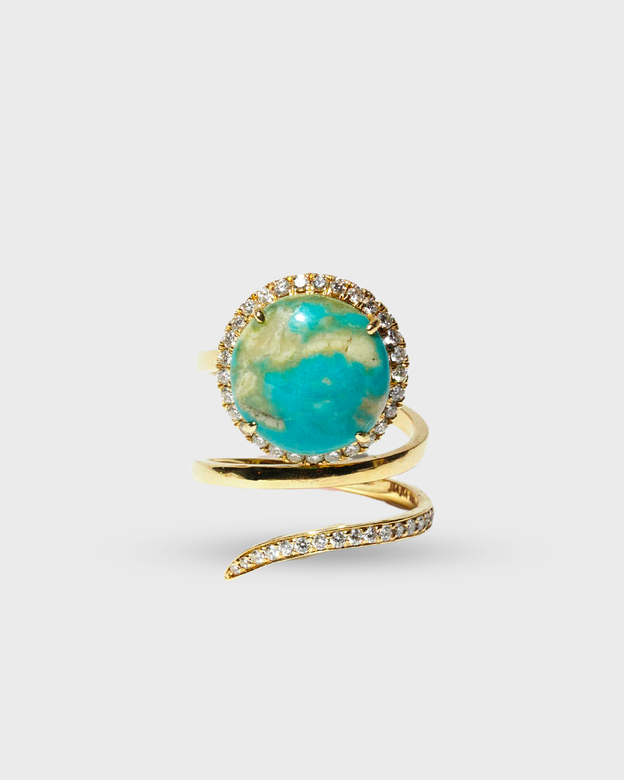 Turquoise is from a recent mine discovered in the United States called Mona Lisa Turquoise. It is a deep greenish blue color and banded with beige throughout. It's a beautiful and rare find. Turquoise and golden spiral is surrounded by diamonds.