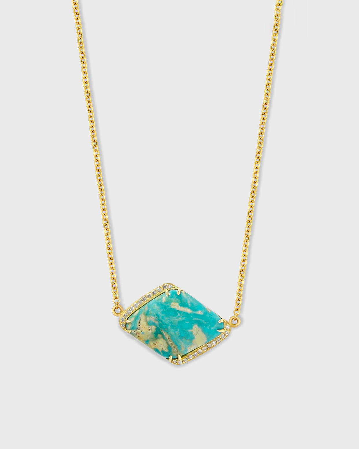 Turquoise is from a recent mine discovered in the United States called Mona Lisa Turquoise. It is a deep greenish blue color and banded with beige throughout. It's a beautiful and rare find. Turquoise is met with asymmetrical diamond setting suspended on a diamond cut gold chain.