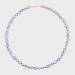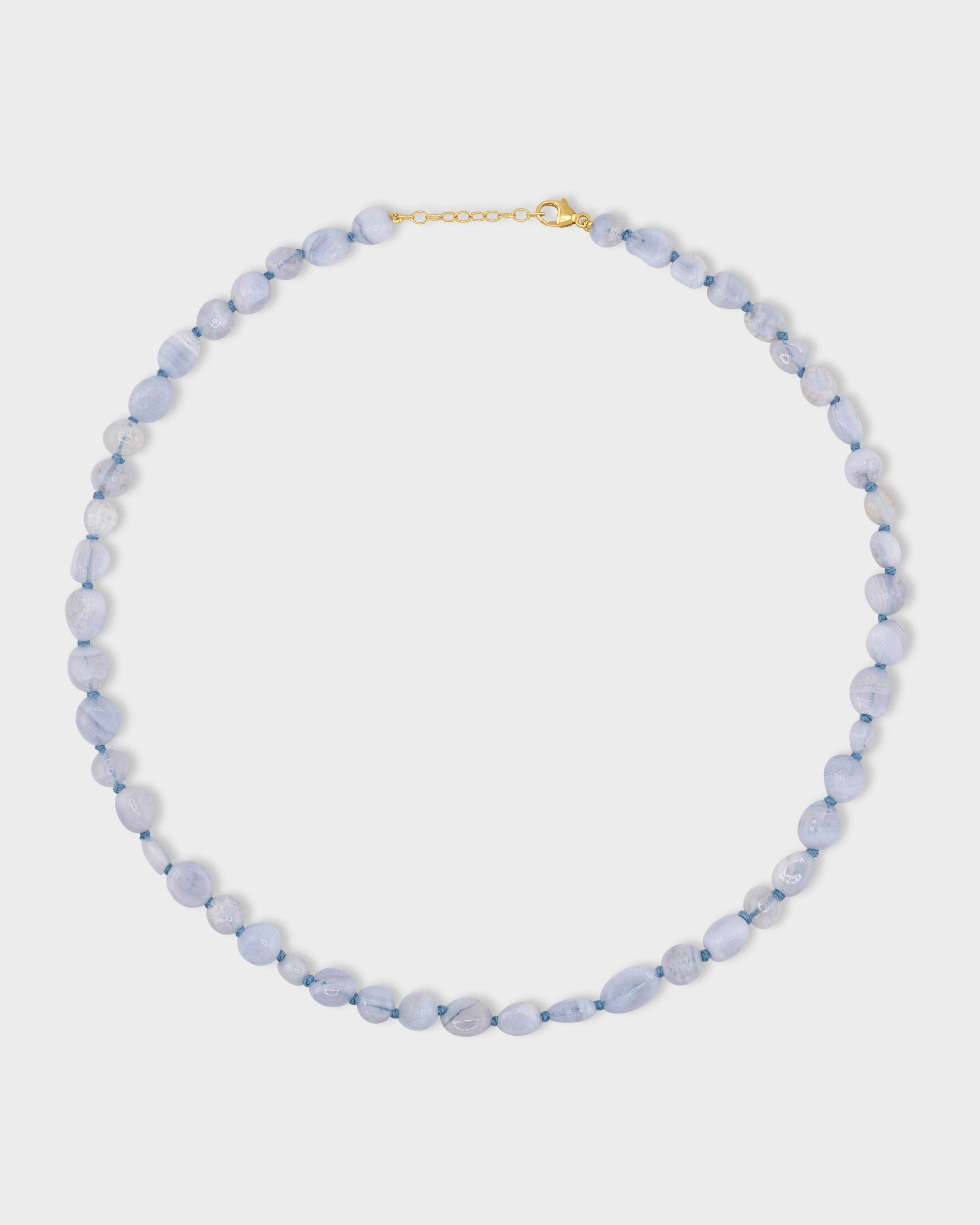 The Arizona Blue Lace Agate Pebble Necklace is strung with soft blue, banded agate beads in organic pebble shapes, evoking serene skies and desert horizons. Its calming hues and natural flow bring a soothing, elegant touch to any style.