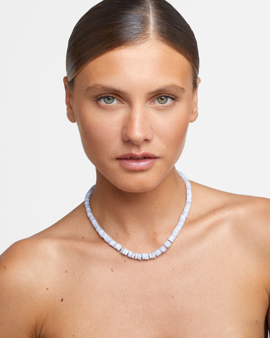 Blue lace agate faceted cut gemstone necklace in beautiful pastel blue hand strung in New York and finished with 14 karat gold hardware.