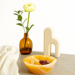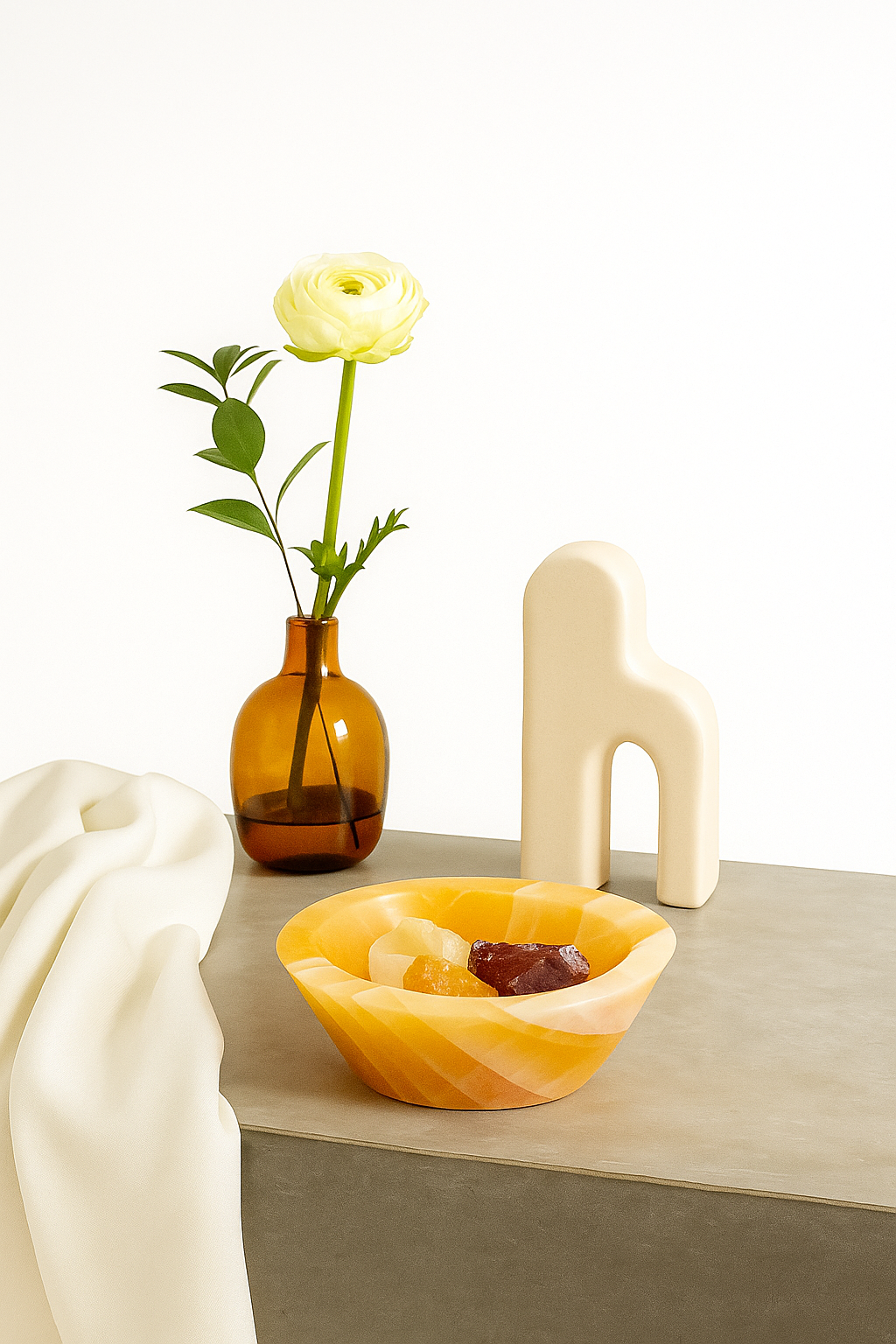 Hand-carved from radiant honey calcite, this luminous bowl embodies warmth and vitality. Its golden hue captures the light beautifully, symbolizing clarity, confidence, and joy — an uplifting accent for displaying crystals, jewelry, or cherished treasures.