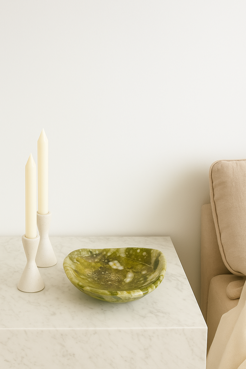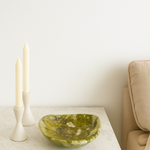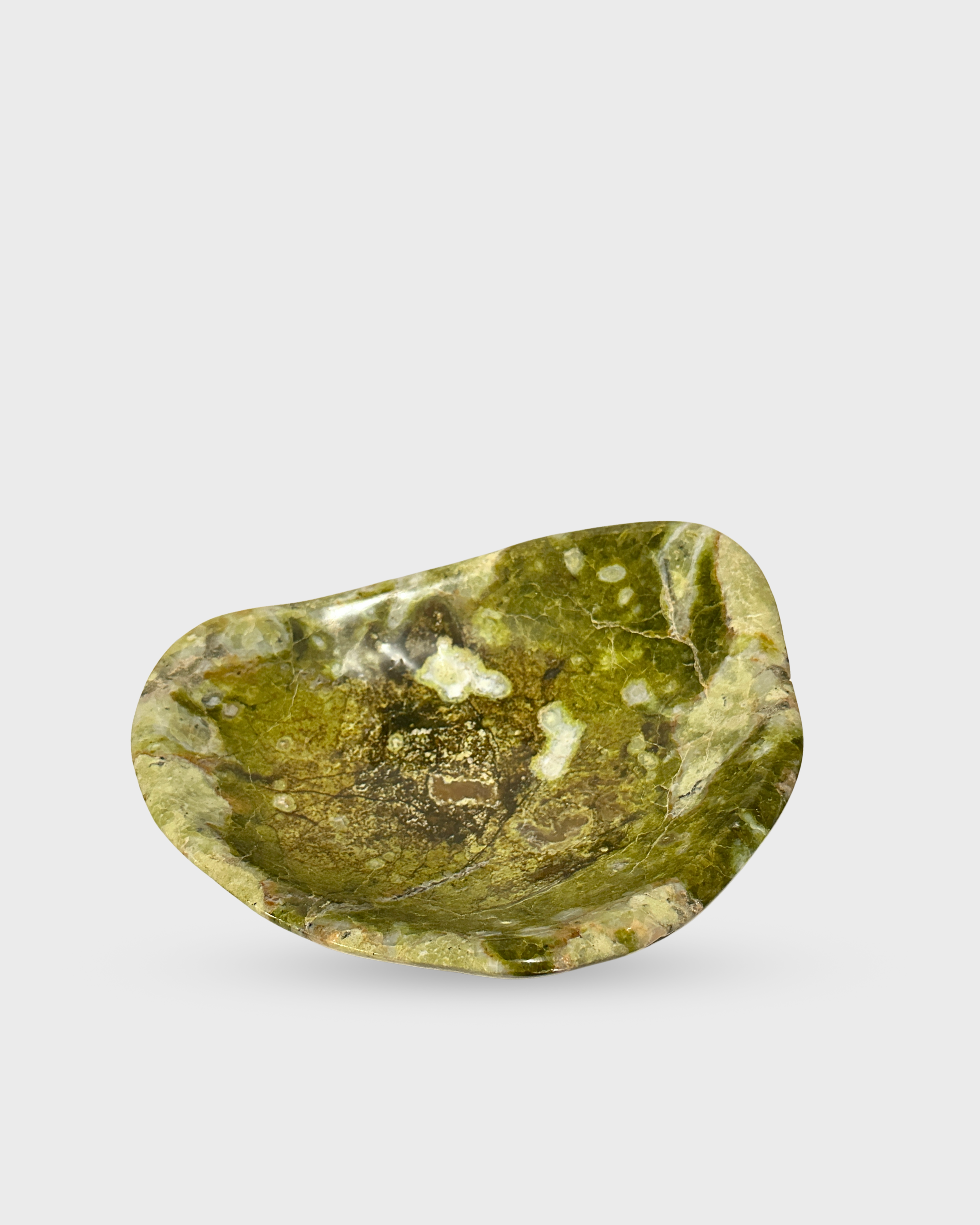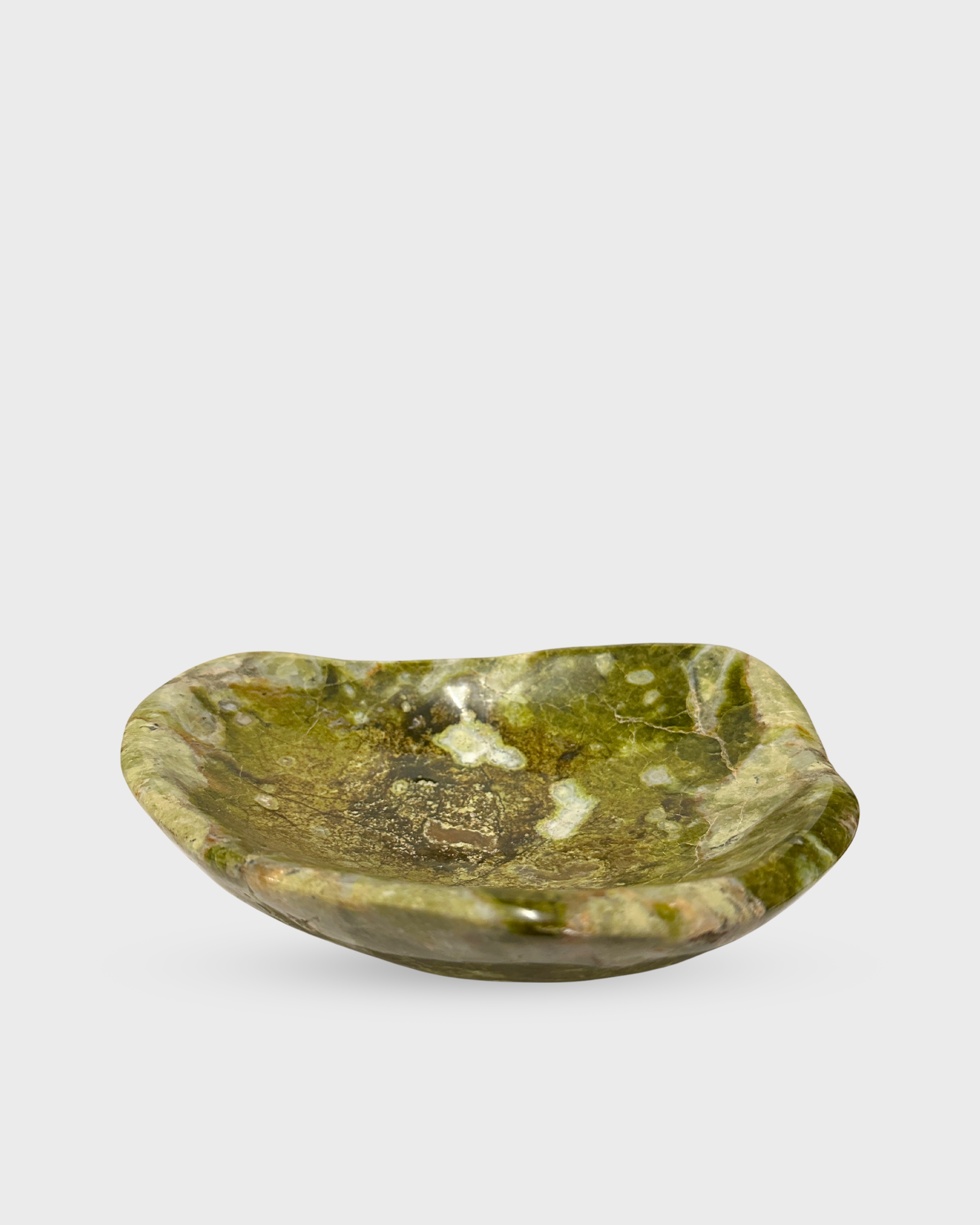 Hand-carved from natural green serpentine, this organically shaped bowl features earthy tones and unique veining. Revered for its grounding and rejuvenating properties, it’s a beautiful vessel for displaying crystals, jewelry, or other cherished objects, inviting balance and renewal into any space.
