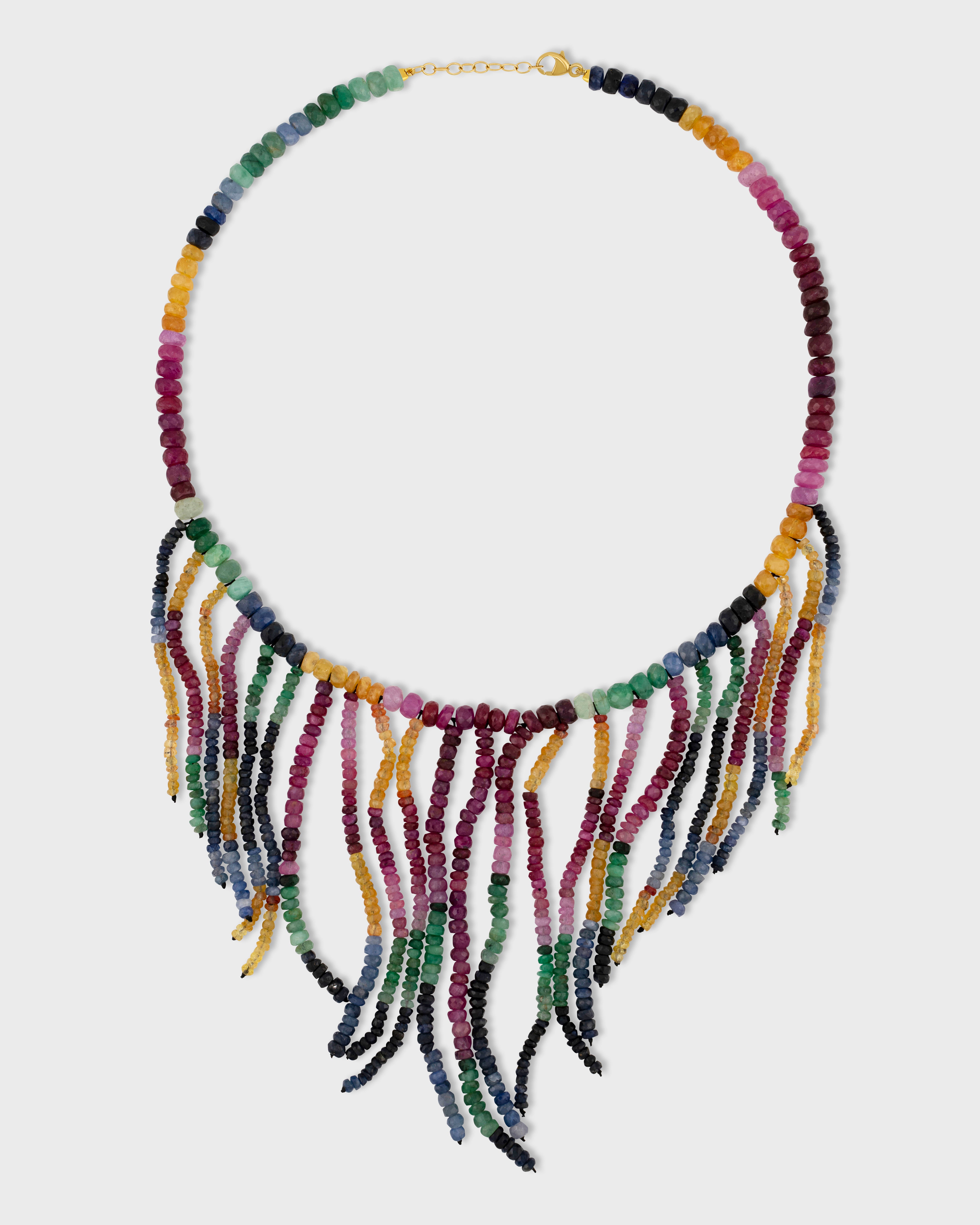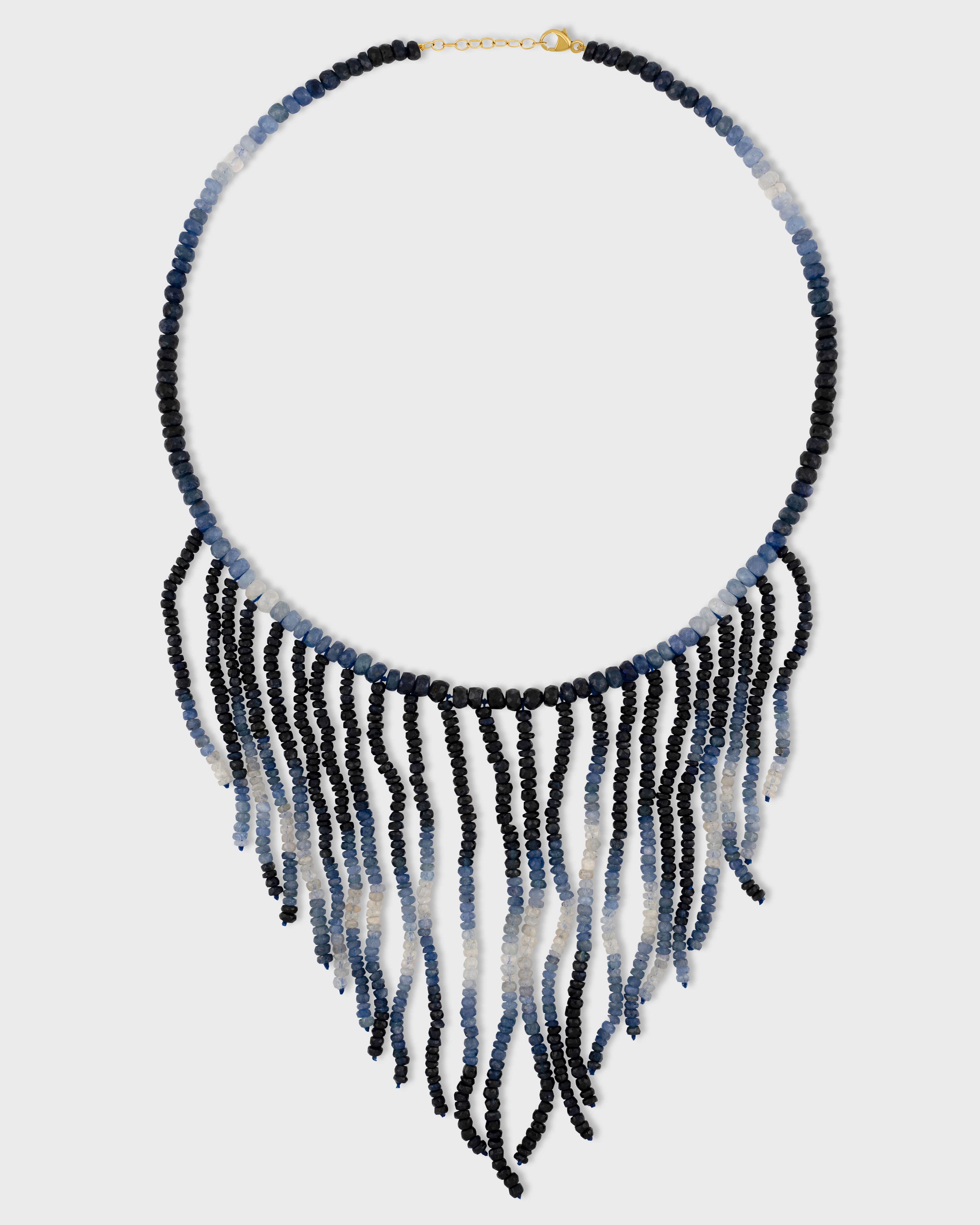 Hand strung blue sapphire necklace. We hand knotted large jumbo sapphires with smaller sapphire beads into fringe to create a high vibrational and impactful necklace.