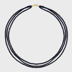 Three layers of blue sapphire hand strung in the heart of New York City and finished with 14 karat yellow gold.