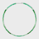 The Arizona Chrysoprase Ombre Necklace features smooth, rondelle-shaped chrysoprase beads that gradually shift in color from light to dark green. This ombre effect creates a stunning visual transition, showcasing the natural beauty and vibrancy of chrysoprase, making it a perfect addition to any jewelry collection.