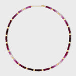 Handcrafted in NYC. This stunning piece features ruby gemstones interspersed with modern soft cube gold beads.