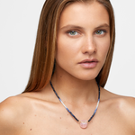 This elegant necklace features an ombre transition of blue sapphires with the soft, calming tones of rose quartz, anchored by a central crystal quartz pendant. The design is inspired by the harmony of the Arizona desert landscape, blending cool and warm tones perfectly.