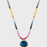 This vibrant necklace features a rainbow of colorful sapphires, creating a stunning gradient of color. A large, dazzling London Blue Topaz gemstone hangs as a pendant, adding a touch of elegance and luxury to this eye-catching piece.