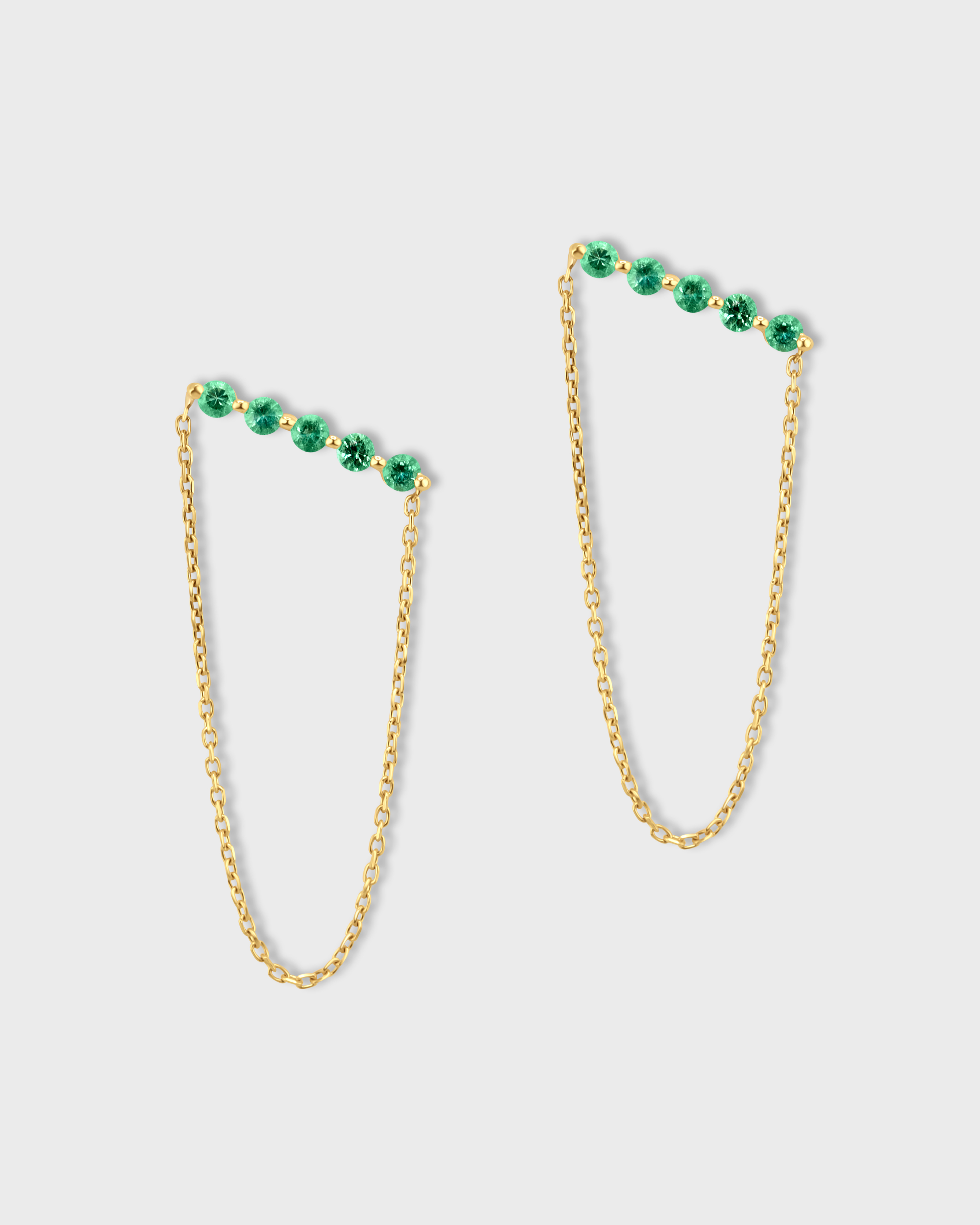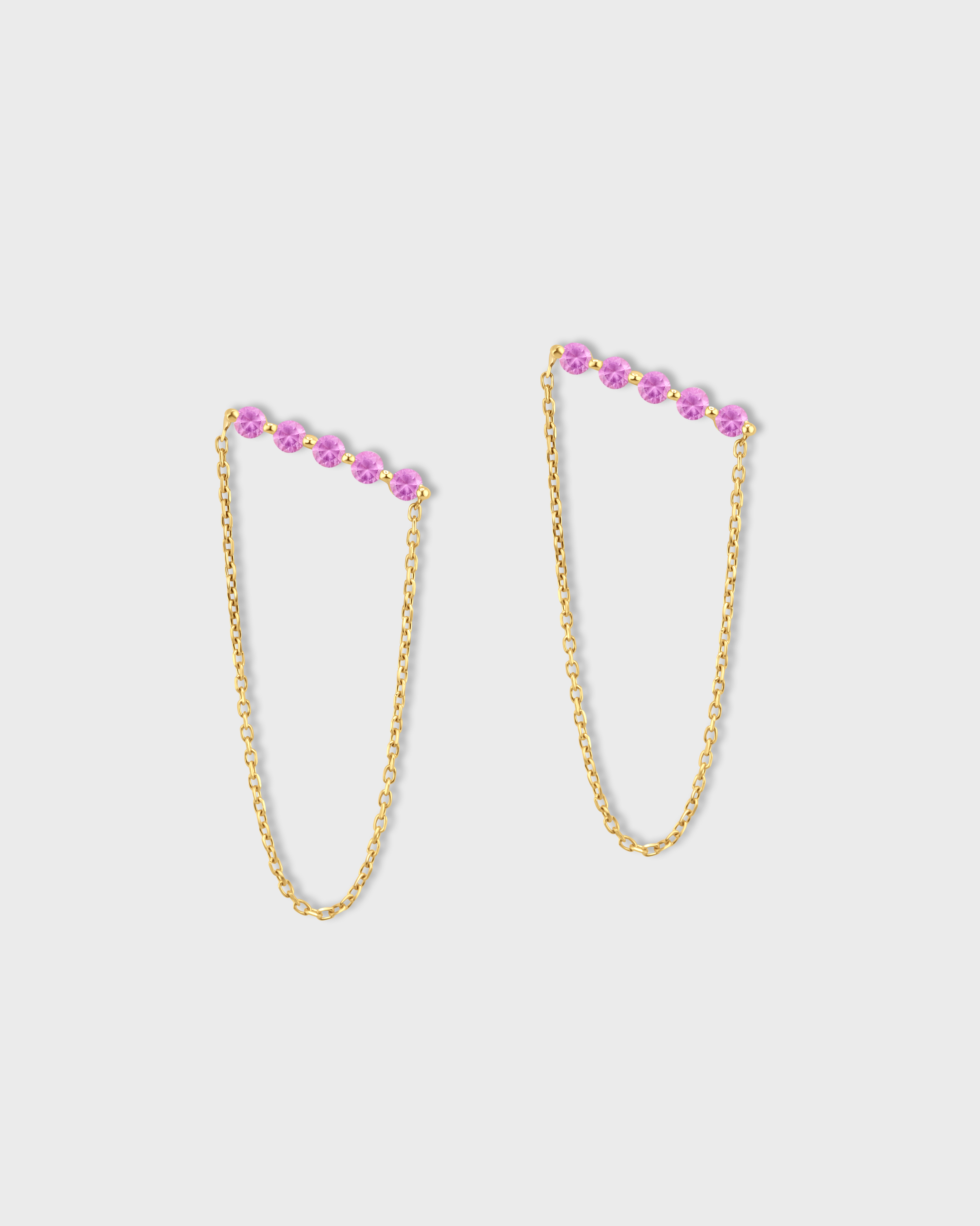 Striking Blue Sapphire bar earrings set in 14k gold with delicate gold loop chain.