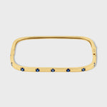 This bangle bracelet is a stunning piece handcrafted in NYC using 14k gold. This soft square-shaped bangle features vibrant blue sapphires set along its front face, creating a dazzling disco-inspired look.