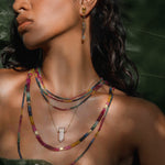 Each beaded jewelry piece is hand strung from the highest quality materials that are cut from natural mineral sources. They are sensitive to prolonged exposure to hairsprays and scents. To ensure longevity please be gentle and avoid tugging and pulling of these pieces.