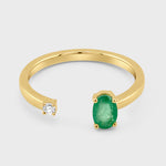 14 karat gold open ring features a vibrant emerald gemstone and diamond.