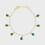 This delicate emerald tear drop gold bezeled bracelet that romantically cascades from the 14 karat gold chain.