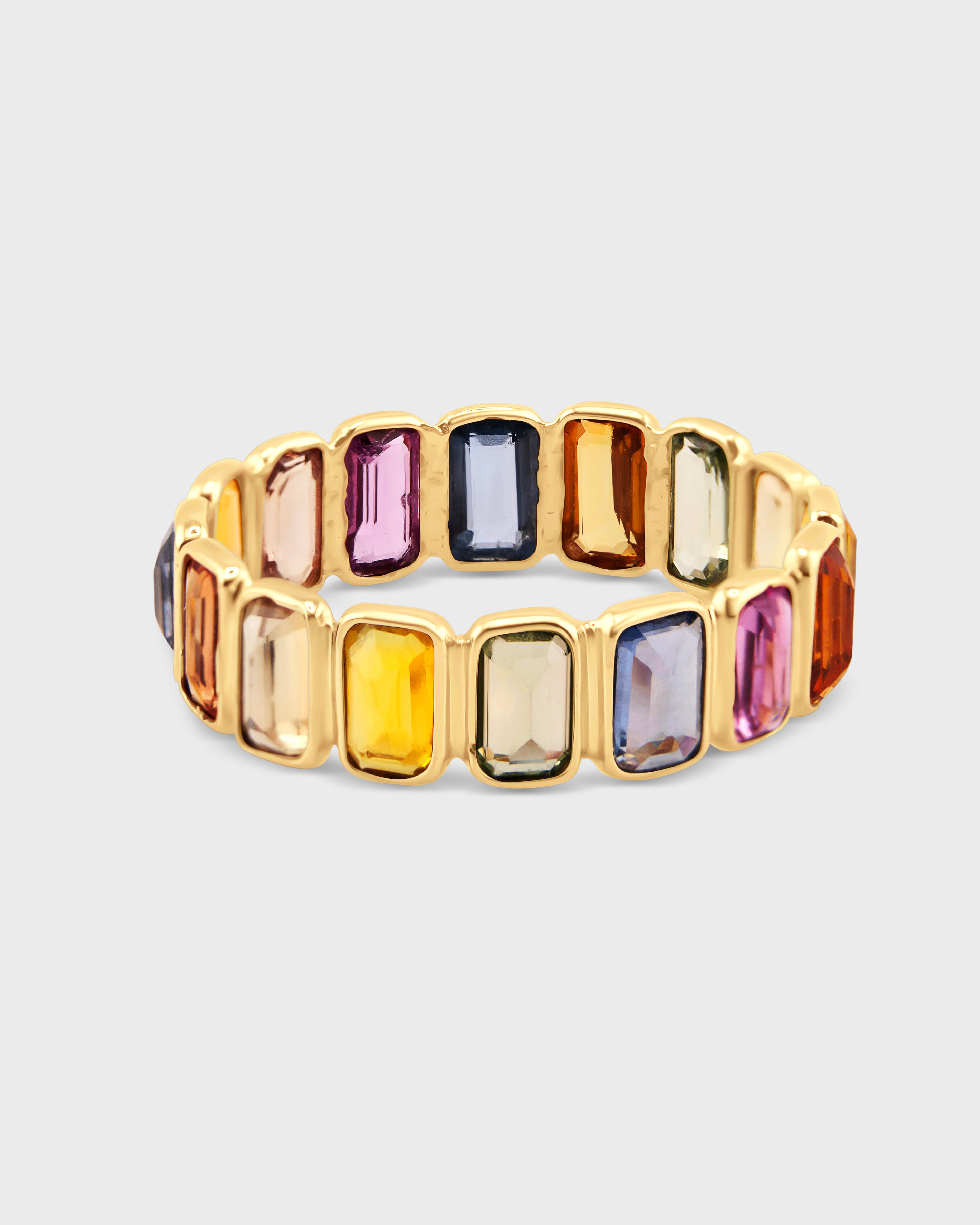 A full spectrum of radiant rainbow sapphires encircles the band, celebrating color, intention, and harmony. Handcrafted in 14K gold, this ring adds a vibrant, uplifting glow to your everyday style.