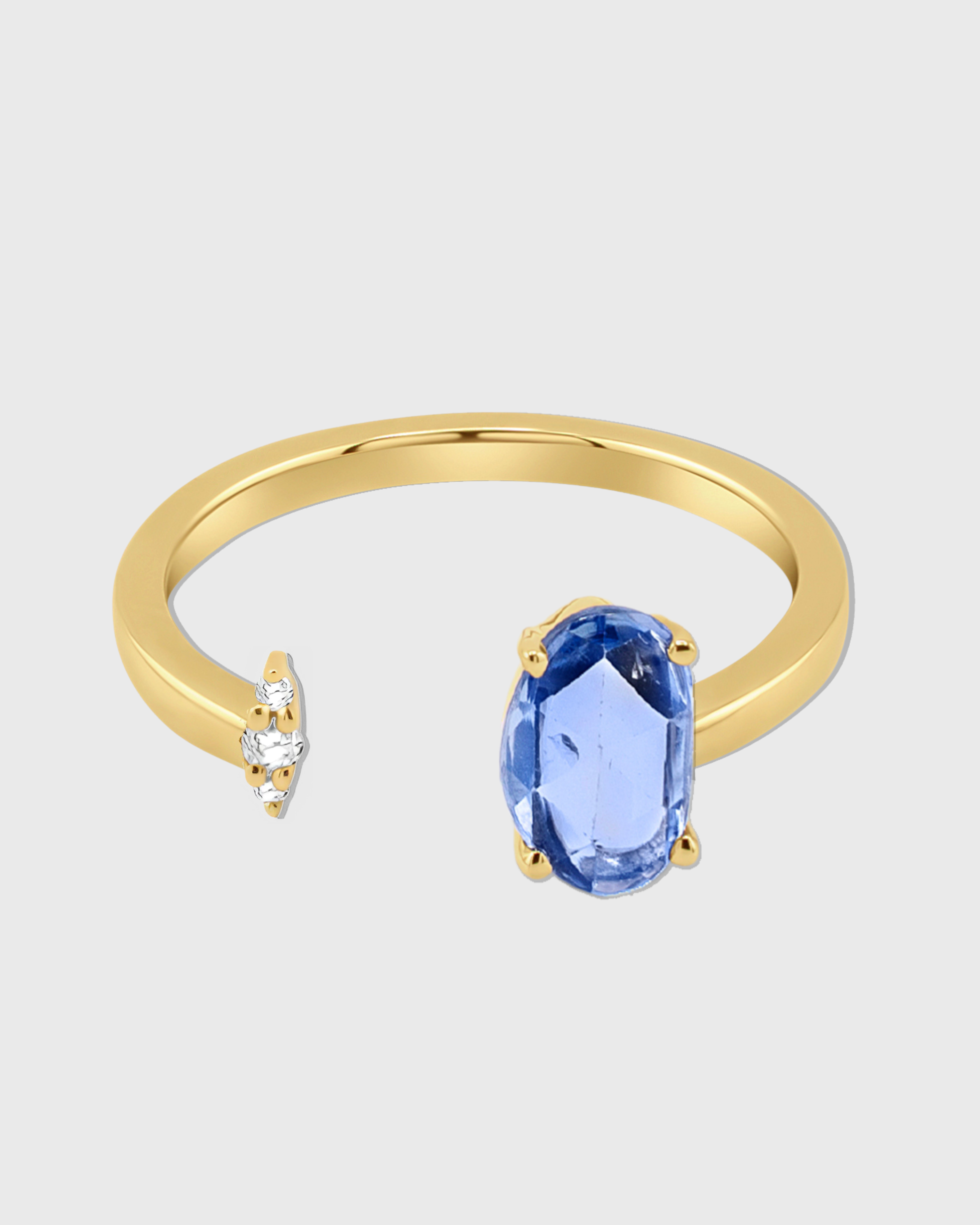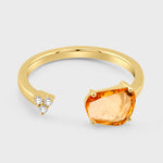 A stunning piece handcrafted in NYC. This 14k gold ring features a vibrant yellow sapphire offset by a delicate trio of diamonds. The open design creates a modern, eye-catching look perfect for everyday elegance or special occasions. A unique addition to any jewelry collection.