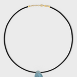 This necklace showcases a raw aquamarine gemstone, mounted on a minimalist leather cord with a gold clasp. Its serene blue hue evokes calmness and clarity, making it a perfect addition to the Crystalline Collection.