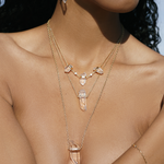 Three crystal quartz set with a gold bar adorned with diamond bezels between each crystal. Elegant to layer or to wear on its own. Master of all healing crystals, our clear crystal quartz is custom hand set to the natural shape of the stone in 14 karat yellow gold on Italian gold chain. Truly one of a kind piece, created to attune to the vibration of each individual wearer.