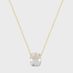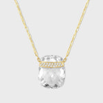The Crystal Quartz Diamond Bar Necklace features a stunning faceted crystal quartz pendant, beautifully wrapped with a diamond-encrusted gold band. This piece is set on a delicate gold chain, offering a refined and timeless elegance.