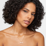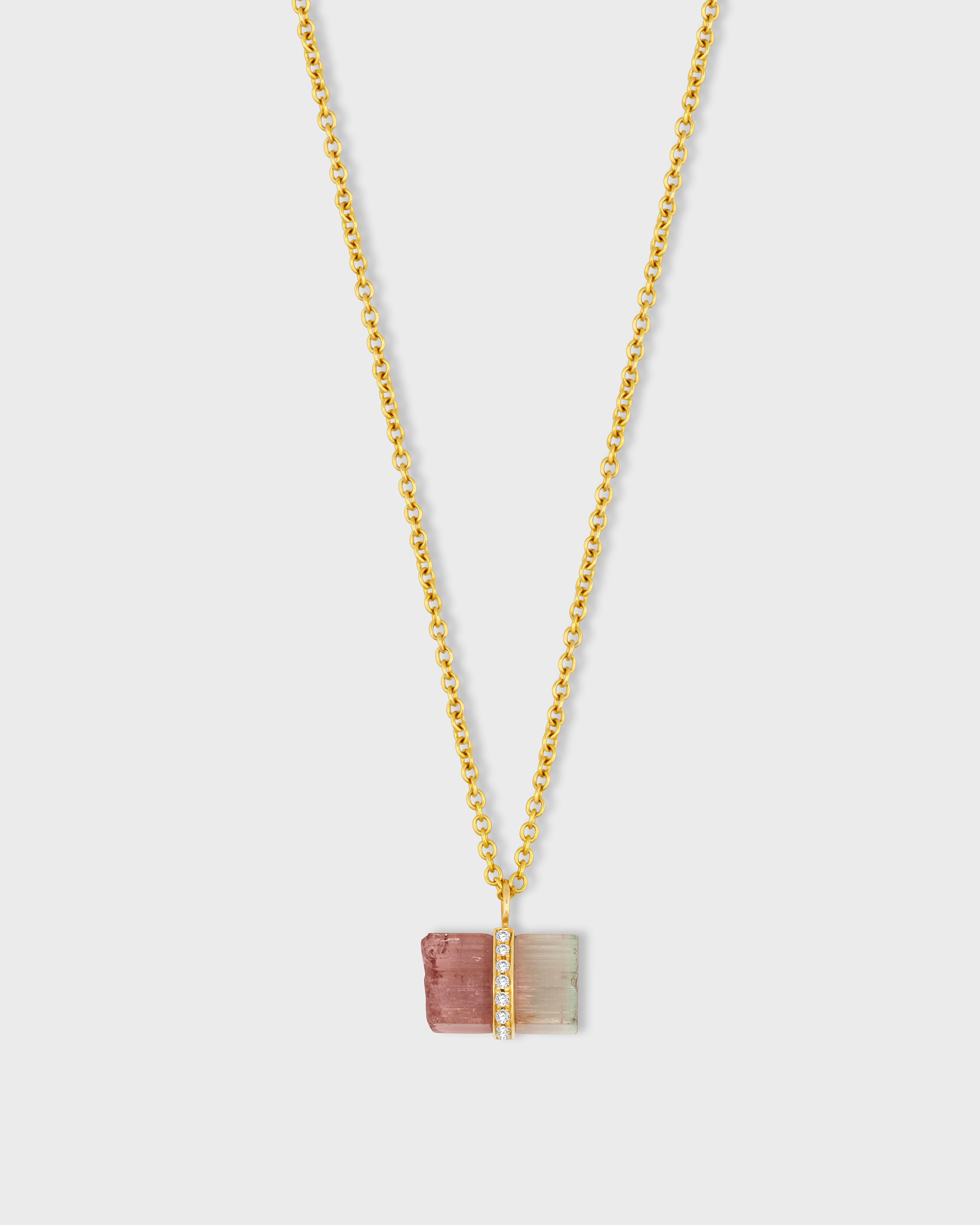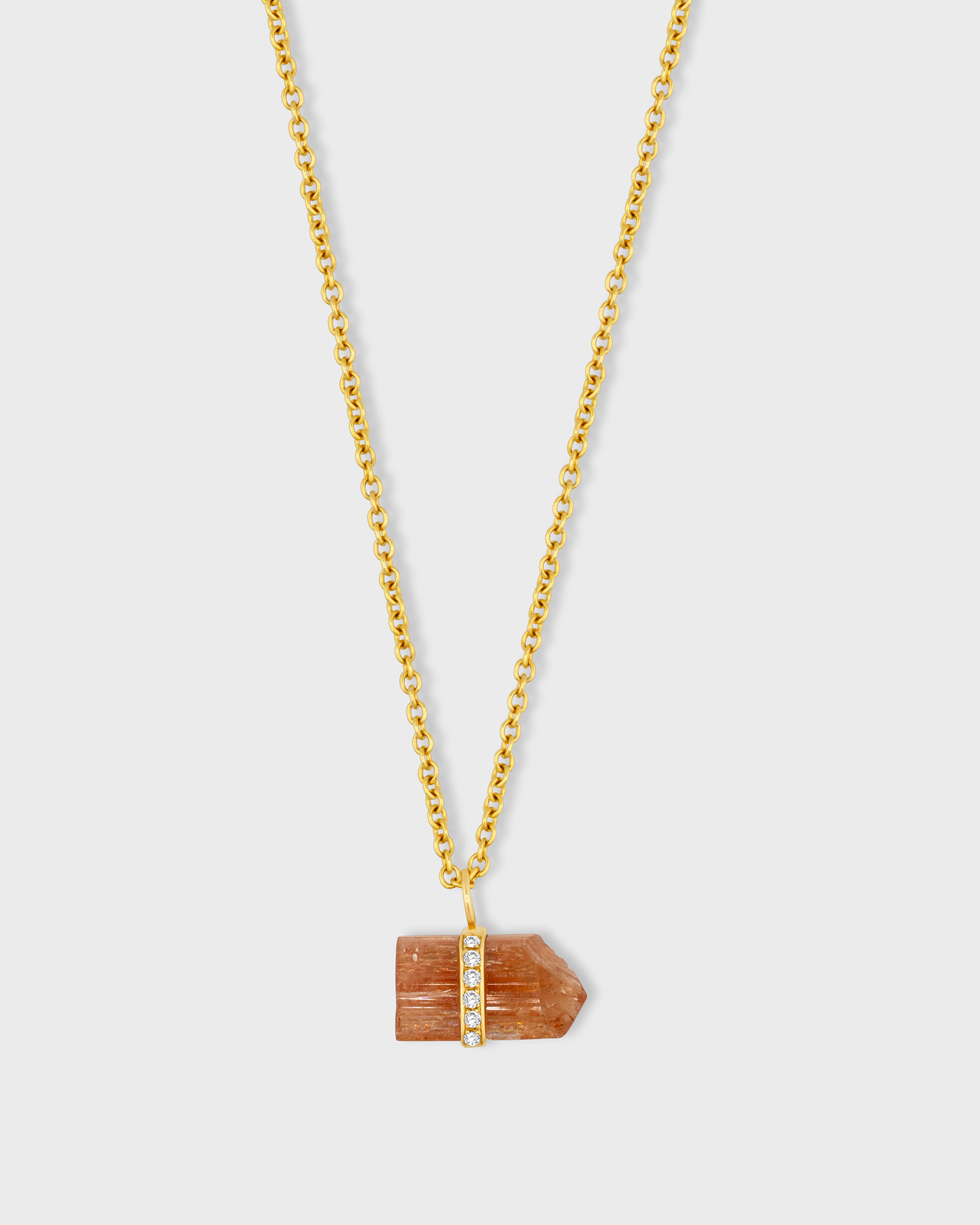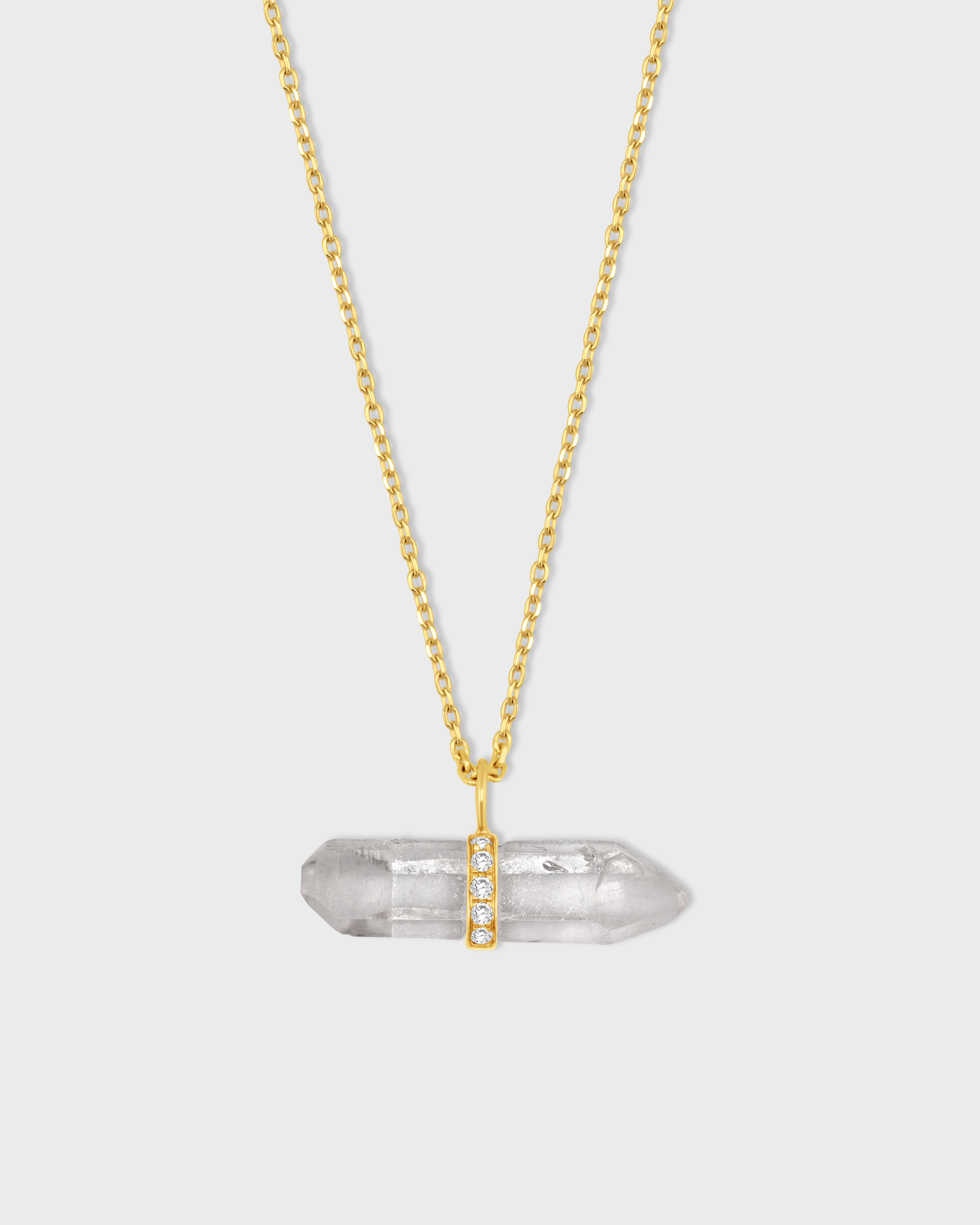 This captivating necklace showcases the raw and natural beauty of a mesmerizing crystal quartz gemstone. The lustrous 14K gold bar adorned with shimmering diamonds adds a touch of refined glamour.