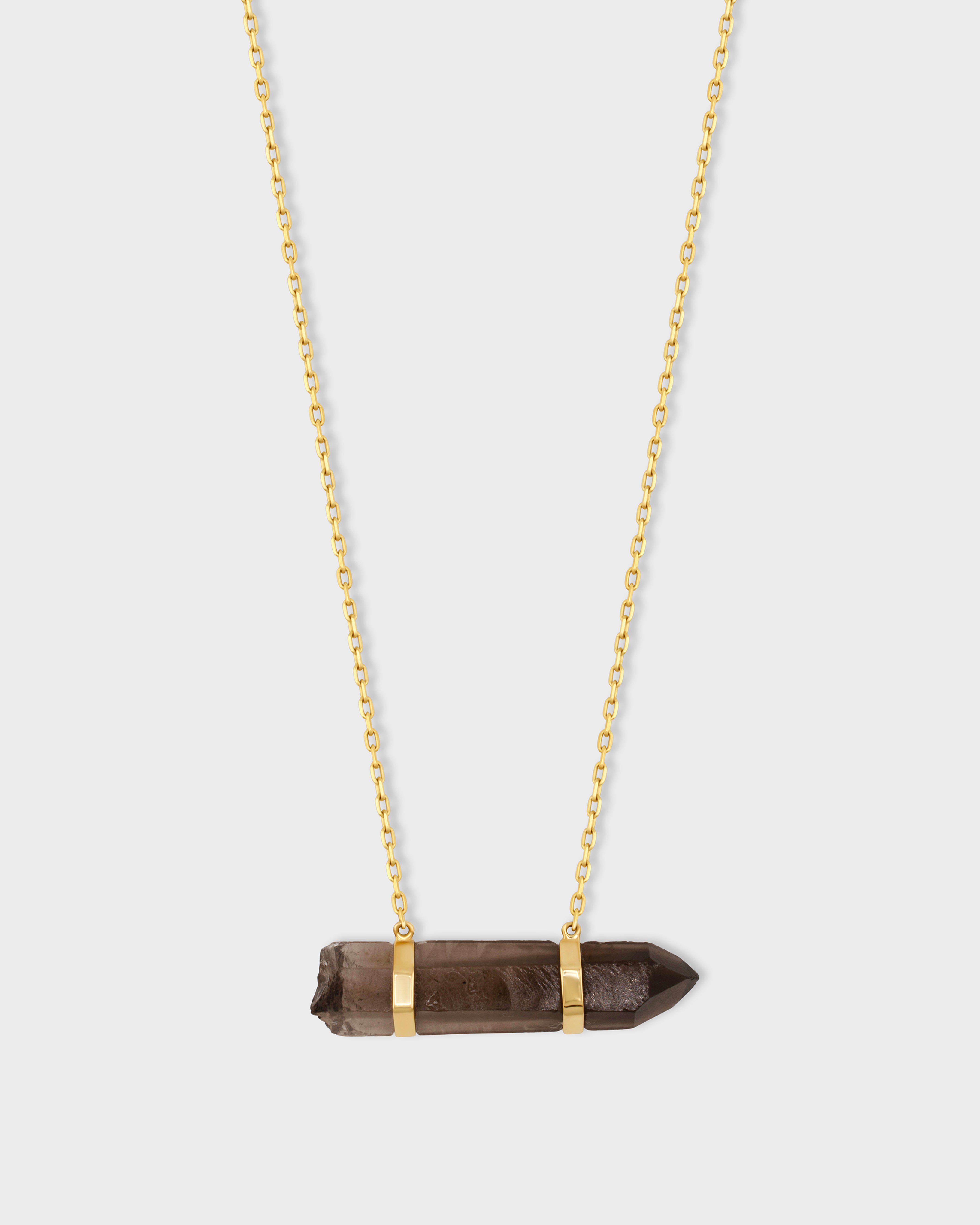 Crystal quartz suspended by two custom set gold bars on both sides. Master of all healing crystals, our clear crystal quartz is custom hand set to the natural shape of the stone in 14 karat yellow gold on Italian gold chain. Truly one of a kind piece, created to attune to the vibration of each individual wearer.
