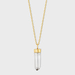 This delicate one of a kind necklace features a sparkling crystal quartz charm with a yellow gold cap and suspended from a dainty 14k gold chain. Crystal quartz is known for its natural beauty and is believed to amplify energy and intention. The gold cap adds a touch of luxury and sparkle to the piece. This necklace is handcrafted in NYC and is a perfect everyday piece that adds a touch of elegance to any outfit.