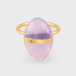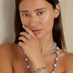 A rare milky translucent lavender purple crystal. Colors and shapes are all natural and untreated. Custom hand set in 14 karat gold.