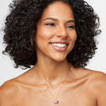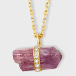 This brilliant necklace showcases the captivating beauty of a rare and vibrant bubblegum pink raw topaz gemstone.