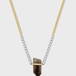 The Smoky Quartz Diamond Bezel Necklace features a bold, raw smoky quartz pendant, elegantly set between diamond-encrusted bezels. The piece is complemented by a luxurious chain, blending earthy natural beauty with refined elegance, perfect for making a statement.