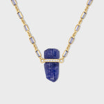 The Tanzanite Diamond Bar Tennis Necklace features a striking tanzanite crystal pendant, encircled by a sparkling diamond bar, and is set on a delicate chain of rectangular tanzanite stones. This luxurious piece combines vibrant color and elegance, perfect for making a bold statement.