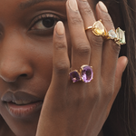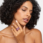 One of a kind mystical amethyst in emerald and oval cut gemstones. Custom hand set in 14 karat gold for an impactful statement.
