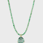 This elegant necklace features a beautiful emerald and opal connection with jumbo fluorite charm set in a 14K gold handcrafted in New York City.