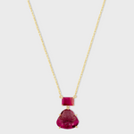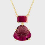 This charming necklace features a smiling Buddha carved from pink tourmaline gemstone adorned with a pink tourmaline gemstone crown.