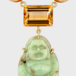This handmade necklace features a cheerful Happy Buddha pendant carved from chrysoprase, set in 14k gold, with citrine beads adding a warm, radiant touch. Crafted in NYC, it's a vibrant and unique statement piece.