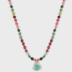The Happy Buddha Diamond Jade Tourmaline Necklace features a serene jade Buddha pendant, symbolizing peace and happiness, surrounded by vibrant tourmaline beads in a beautiful array of colors. The necklace is finished with diamond accents, adding a touch of elegance and energy to this joyful, meaningful piece.