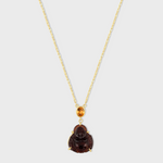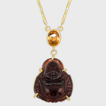 This necklace features a Happy Buddha pendant carved from Garnet, set in 14k gold, with Yellow Sapphire crown adding a sophisticated, elegant touch. Meticulously handcrafted in NYC.