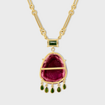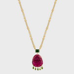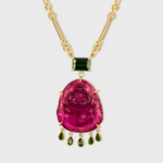 This charming necklace features a smiling Buddha carved from pink tourmaline gemstone adorned with a green tourmaline gemstone crown and dangles.